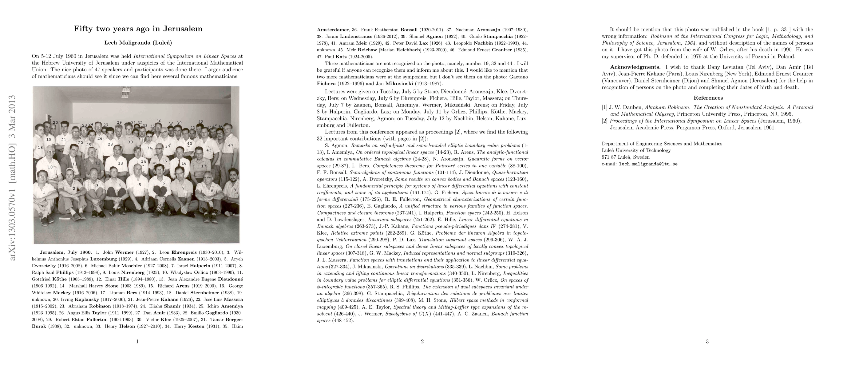 Short information about the conference in 1960 in Jerusalem is presented together with an interesting photo where we can find several famous mathematicians participated in this conference. To recognize the people on the photo and collect their date of birth and death took me over five years. It was plan to have ready this note in 2010 on fifty years after conference. Unfortunately, this was not possible. Stil there are three persons which are not recognized. Maybe this publication will help to recognize them. In May 2012 I was trying to publish this article in Mathematical Intelligencer, but they would be willing to consider a longer, substantially revised, version. Also Notices AMS does not publish articles about conferences.