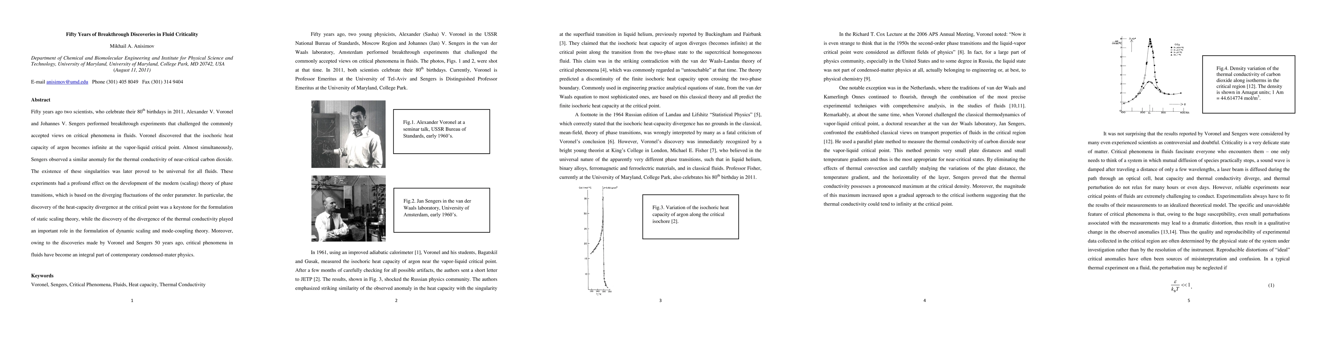 Fifty years ago two scientists, who celebrate their 80th birthdays in 2011, Alexander V. Voronel and Johannes V. Sengers performed breakthrough experiments that challenged the commonly accepted views on critical phenomena in fluids. Voronel discovered that the isochoric heat capacity of argon becomes infinite at the vapor-liquid critical point. Almost simultaneously, Sengers observed a similar anomaly for the thermal conductivity of near-critical carbon dioxide. The existence of these singularities was later proved to be universal for all fluids. These experiments had a profound effect on the development of the modern (scaling) theory of phase transitions, which is based on the diverging fluctuations of the order parameter. In particular, the discovery of the heat-capacity divergence at the critical point was a keystone for the formulation of static scaling theory, while the discovery of the divergence of the thermal conductivity played an important role in the formulation of dynamic scaling and mode-coupling theory. Moreover, owing to the discoveries made by Voronel and Sengers 50 years ago, critical phenomena in fluids have become an integral part of contemporary condensed-matter physics.