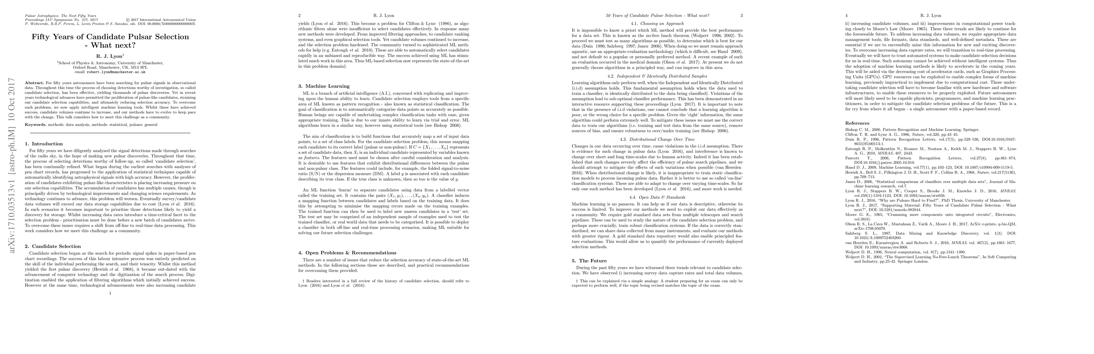 For fifty years astronomers have been searching for pulsar signals in observational data. Throughout this time the process of choosing detections worthy of investigation, so called candidate selection, has been effective, yielding thousands of pulsar discoveries. Yet in recent years technological advances have permitted the proliferation of pulsar-like candidates, straining our candidate selection capabilities, and ultimately reducing selection accuracy. To overcome such problems, we now apply intelligent machine learning tools. Whilst these have achieved success, candidate volumes continue to increase, and our methods have to evolve to keep pace with the change. This talk considers how to meet this challenge as a community.