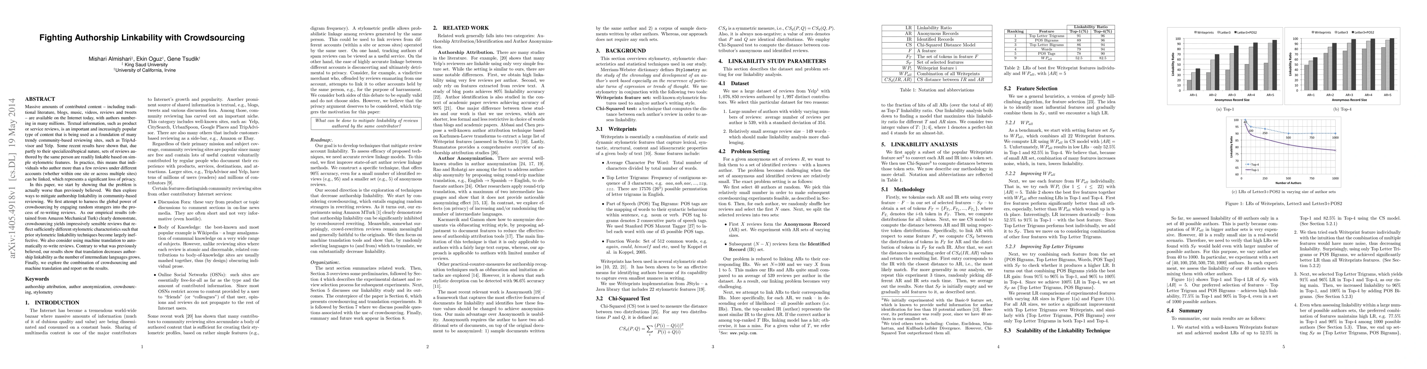 Massive amounts of contributed content -- including traditional literature, blogs, music, videos, reviews and tweets -- are available on the Internet today, with authors numbering in many millions. Textual information, such as product or service reviews, is an important and increasingly popular type of content that is being used as a foundation of many trendy community-based reviewing sites, such as TripAdvisor and Yelp. Some recent results have shown that, due partly to their specialized/topical nature, sets of reviews authored by the same person are readily linkable based on simple stylometric features. In practice, this means that individuals who author more than a few reviews under different accounts (whether within one site or across multiple sites) can be linked, which represents a significant loss of privacy. In this paper, we start by showing that the problem is actually worse than previously believed. We then explore ways to mitigate authorship linkability in community-based reviewing. We first attempt to harness the global power of crowdsourcing by engaging random strangers into the process of re-writing reviews. As our empirical results (obtained from Amazon Mechanical Turk) clearly demonstrate, crowdsourcing yields impressively sensible reviews that reflect sufficiently different stylometric characteristics such that prior stylometric linkability techniques become largely ineffective. We also consider using machine translation to automatically re-write reviews. Contrary to what was previously believed, our results show that translation decreases authorship linkability as the number of intermediate languages grows. Finally, we explore the combination of crowdsourcing and machine translation and report on the results.