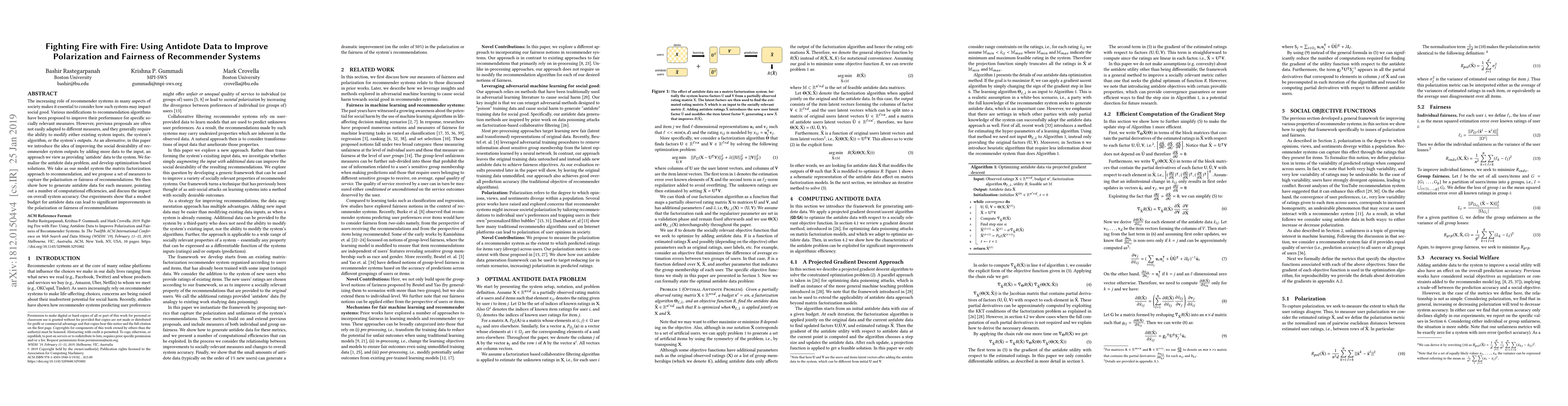 This paper proposes using "antidote data" to enhance the polarization and fairness of recommender systems without altering existing inputs or algorithms. It introduces optimization-based solutions to generate this data, demonstrating significant improvements in fairness and polarization measures with minimal impact on overall system accuracy.