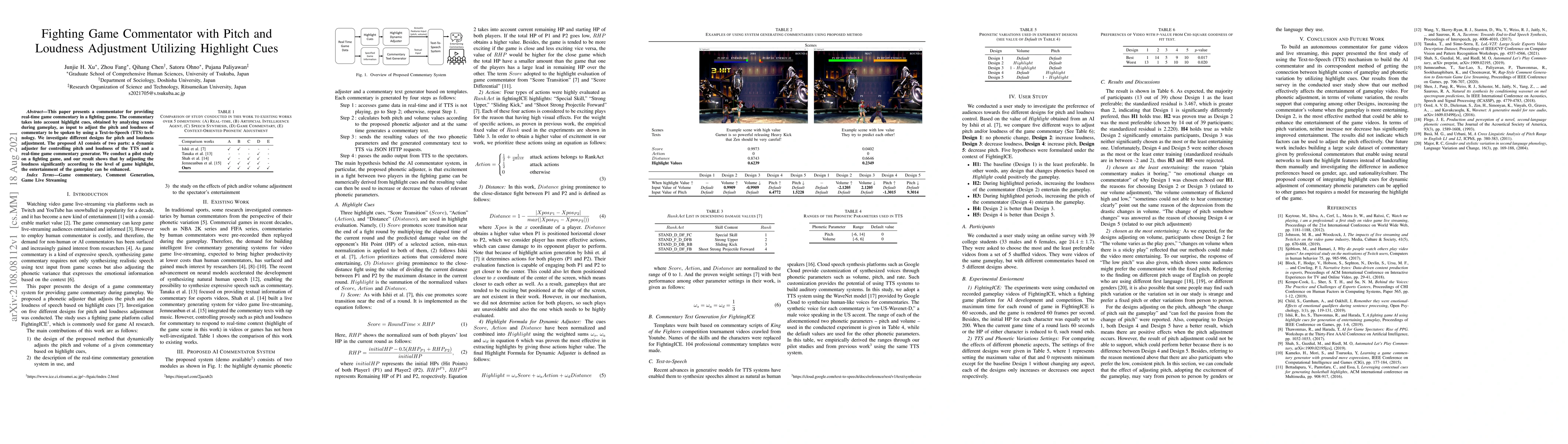 This paper introduces a commentator system for fighting games that uses highlight cues to dynamically adjust the pitch and loudness of real-time commentary via Text-to-Speech technology. The system enhances gameplay entertainment by significantly altering commentary loudness based on the level of game highlights, as demonstrated in a pilot study.