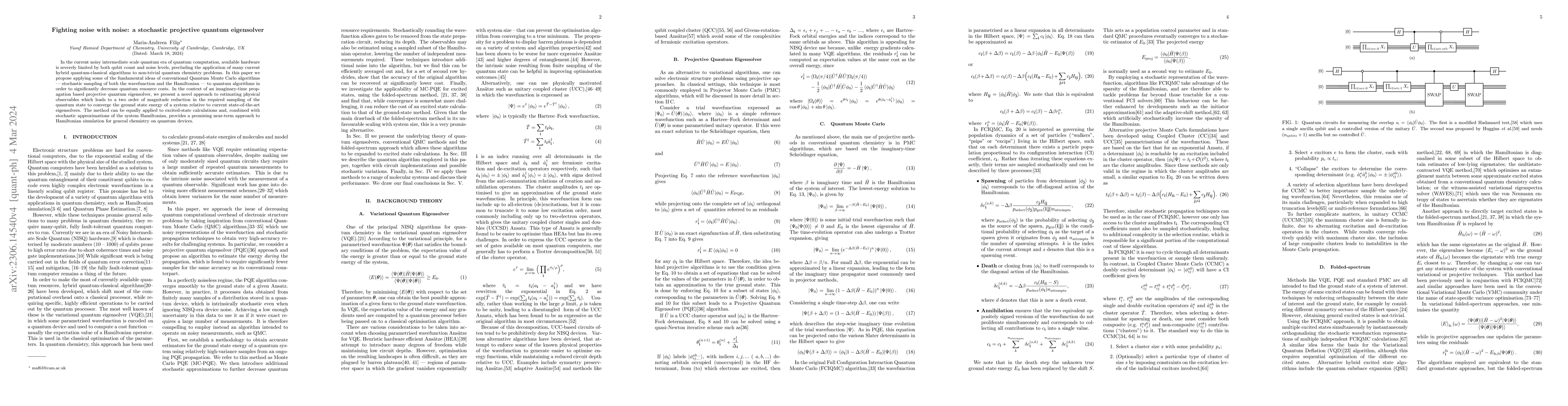 This paper proposes a novel stochastic projective quantum eigensolver that leverages ideas from Quantum Monte Carlo to significantly reduce quantum resource costs in noisy intermediate scale quantum computation. It achieves a two-order of magnitude decrease in required quantum state sampling to estimate ground state energies, offering a promising approach for near-term Hamiltonian simulation in general chemistry.