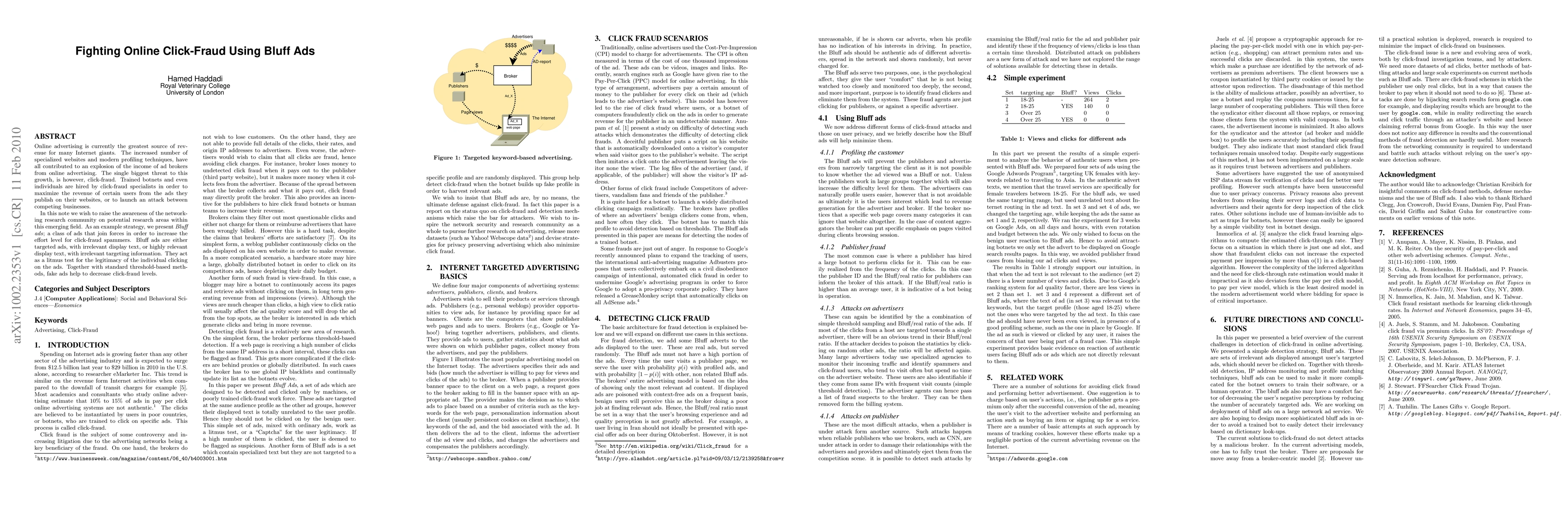 This paper discusses the threat of click-fraud in online advertising and proposes "Bluff ads" as a strategy to combat it. Bluff ads either have irrelevant display text or targeting information, serving as a test to identify fraudulent clicks, thereby reducing click-fraud alongside standard threshold-based methods.