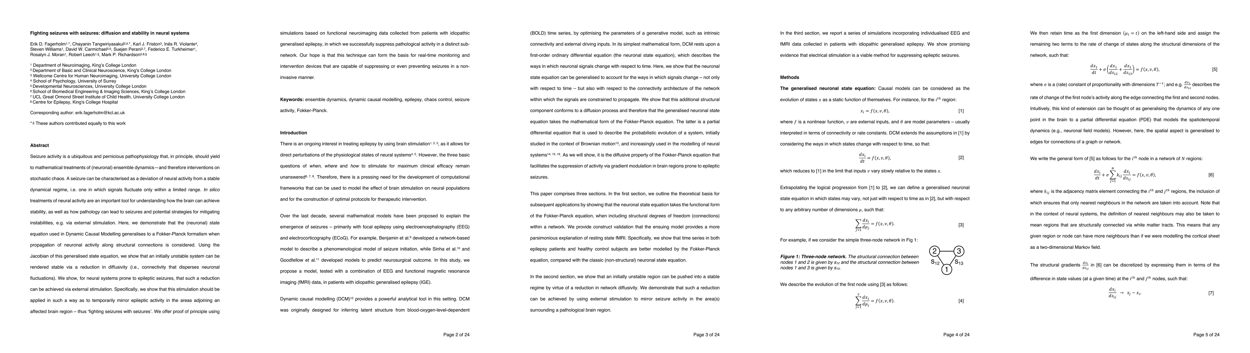 Seizure activity is a ubiquitous and pernicious pathophysiology that, in principle, should yield to mathematical treatments of (neuronal) ensemble dynamics - and therefore interventions on stochastic chaos. A seizure can be characterised as a deviation of neural activity from a stable dynamical regime, i.e. one in which signals fluctuate only within a limited range. In silico treatments of neural activity are an important tool for understanding how the brain can achieve stability, as well as how pathology can lead to seizures and potential strategies for mitigating instabilities, e.g. via external stimulation. Here, we demonstrate that the (neuronal) state equation used in Dynamic Causal Modelling generalises to a Fokker-Planck formalism when propagation of neuronal activity along structural connections is considered. Using the Jacobian of this generalised state equation, we show that an initially unstable system can be rendered stable via a reduction in diffusivity (i.e., connectivity that disperses neuronal fluctuations). We show, for neural systems prone to epileptic seizures, that such a reduction can be achieved via external stimulation. Specifically, we show that this stimulation should be applied in such a way as to temporarily mirror epileptic activity in the areas adjoining an affected brain region - thus 'fighting seizures with seizures'. We offer proof of principle using simulations based on functional neuroimaging data collected from patients with idiopathic generalised epilepsy, in which we successfully suppress pathological activity in a distinct sub-network. Our hope is that this technique can form the basis for real-time monitoring and intervention devices that are capable of suppressing or even preventing seizures in a non-invasive manner.