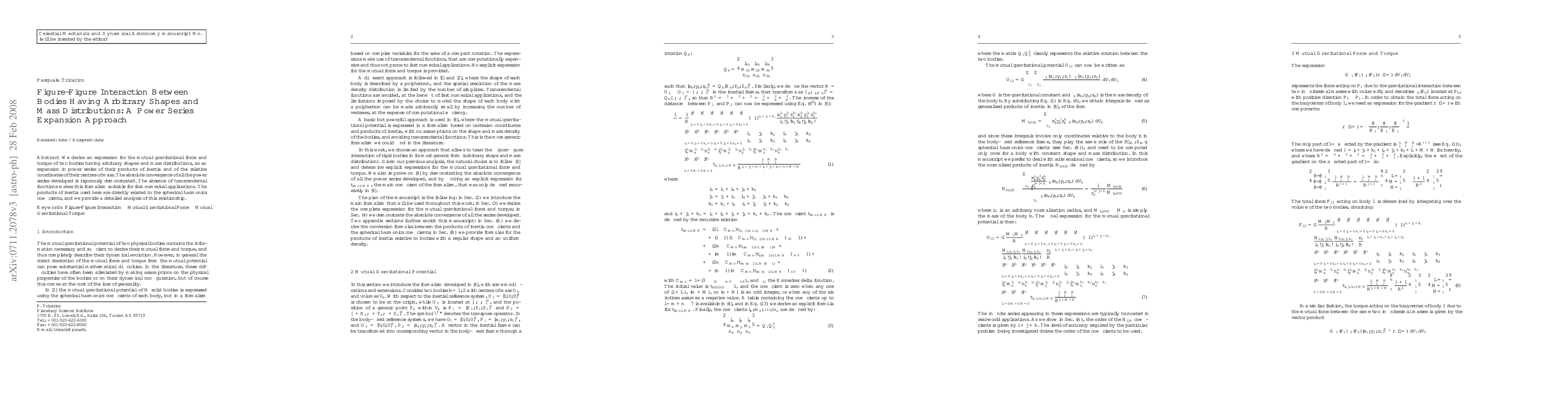 We derive an expression for the mutual gravitational force and torque of two bodies having arbitrary shapes and mass distributions, as an expansion in power series of their products of inertia and of the relative coordinates of their centres of mass. The absolute convergence of all the power series developed is rigorously demonstrated. The absence of transcendental functions makes this formalism suitable for fast numerical applications. The products of inertia used here are directly related to the spherical harmonics coefficients, and we provide a detailed analysis of this relationship.