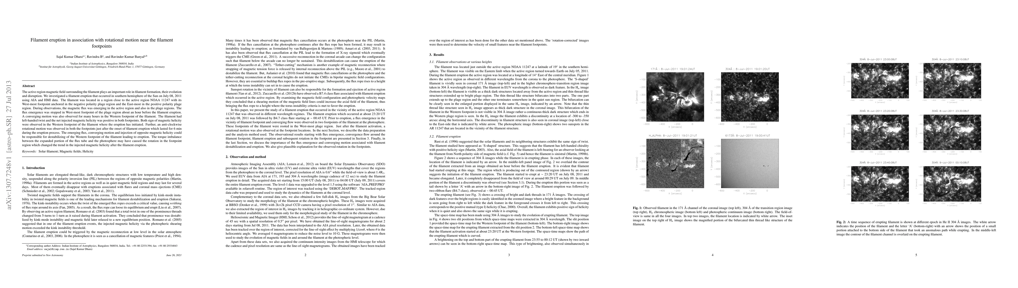 The active region magnetic field surrounding the filament plays an important role in filament formation, their evolution and disruption. We investigated a filament eruption that occurred in southern hemisphere of the Sun on July 08, 2011 using AIA and HMI data. The filament was located in a region close to the active region NOAA 11247 with its West-most footpoint anchored in the negative polarity plage region and the East-most in the positive polarity plage region. During observations, the magnetic flux was emerging in the active region and also in the plage regions. The flux emergence was stopped in West-most footpoint of the plage region about an hour before the filament eruption. A converging motion was also observed for many hours in the Western footpoint of the filament. The filament had left-handed twist and the net injected magnetic helicity was positive in both footpoints. Both sign of magnetic helicity were observed in the Western footpoint of the filament where the eruption has initiated. Further, an anti-clockwise rotational motion was observed in both the footpoints just after the onset of filament eruption which lasted for 6 min during the eruption process. The emerging flux, converging motion and injection of opposite magnetic helicity could be responsible for destabilizing of the Western footpoint of the filament leading to eruption. The torque imbalance between the expanded portion of the flux tube and the photosphere may have caused the rotation in the footpoint region which changed the trend in the injected magnetic helicity after the filament eruption.
