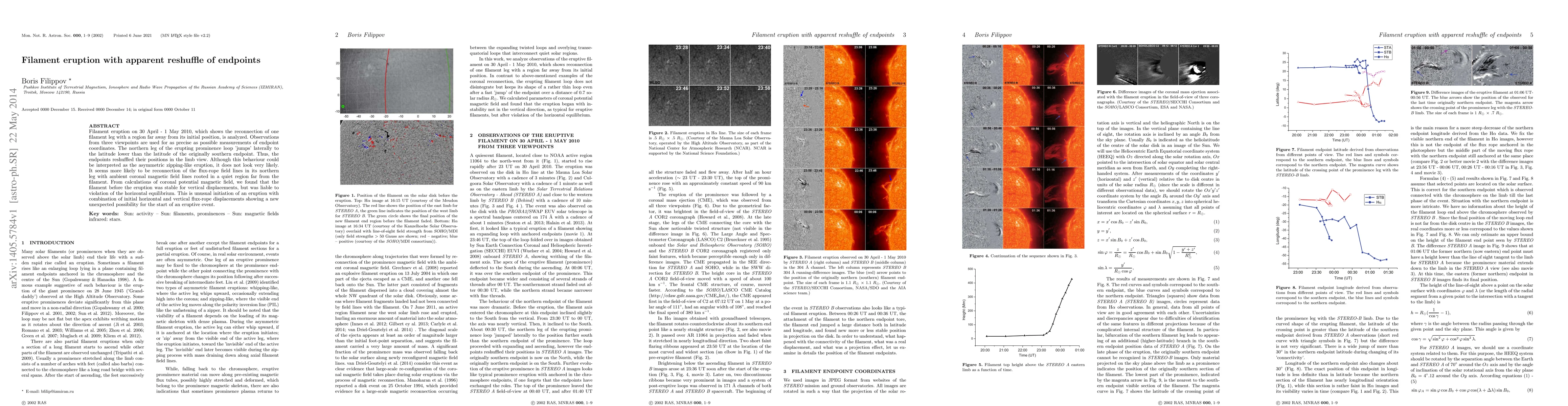 This study analyzes a filament eruption on April 30 - May 1, 2010, where the northern leg reconnected with distant magnetic field lines, causing endpoint reshuffling. The unusual initiation involved both horizontal and vertical displacements, suggesting a new mechanism for eruptive events.