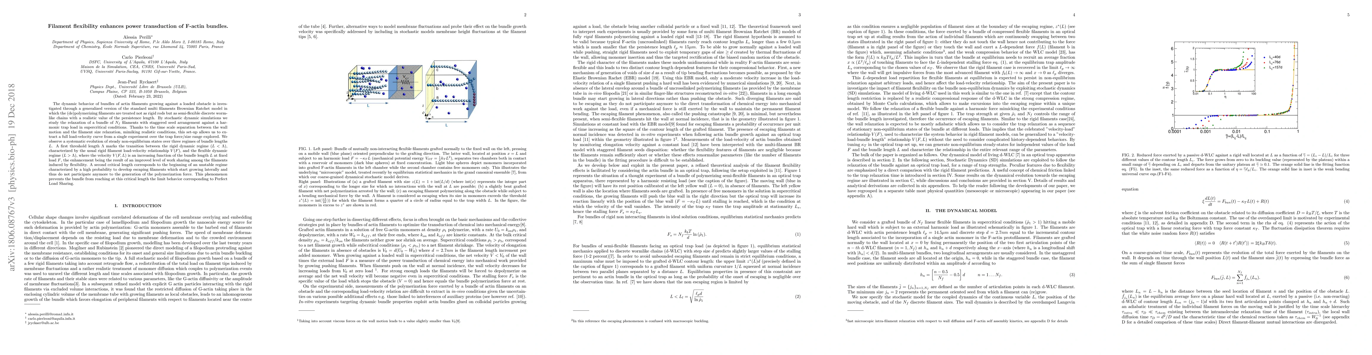 The dynamic behavior of bundles of actin filaments growing against a loaded obstacle is investigated through a generalized version of the standard multi filaments Brownian Ratchet model in which the (de)polymerizing filaments are treated not as rigid rods but as semi-flexible discrete wormlike chains with a realistic value of the persistence length. By stochastic dynamic simulations we study the relaxation of a bundle of $N_f$ filaments with staggered seed arrangement against a harmonic trap load in supercritical conditions. Thanks to the time scale separation between the wall motion and the filament size relaxation, mimiking realistic conditions, this set-up allows us to extract a full load-velocity curve from a single experiment over the trap force/size range explored. We observe a systematic evolution of steady non-equilibrium states over three regimes of bundle lengths $L$. A first threshold length $\Lambda$ marks the transition between the rigid dynamic regime ($L<\Lambda$), characterized by the usual rigid filament load-velocity relationship $V(F)$, and the flexible dynamic regime ($L>\Lambda$), where the velocity $V(F,L)$ is an increasing function of the bundle length $L$ at fixed load $F$, the enhancement being the result of an improved level of work sharing among the filaments induced by flexibility. A second critical length corresponds to the beginning of an unstable regime characterized by a high probability to develop escaping filaments which start growing laterally and thus do not participate anymore to the generation of the polymerization force. This phenomenon prevents the bundle from reaching at this critical length the limit behavior corresponding to Perfect Load Sharing.