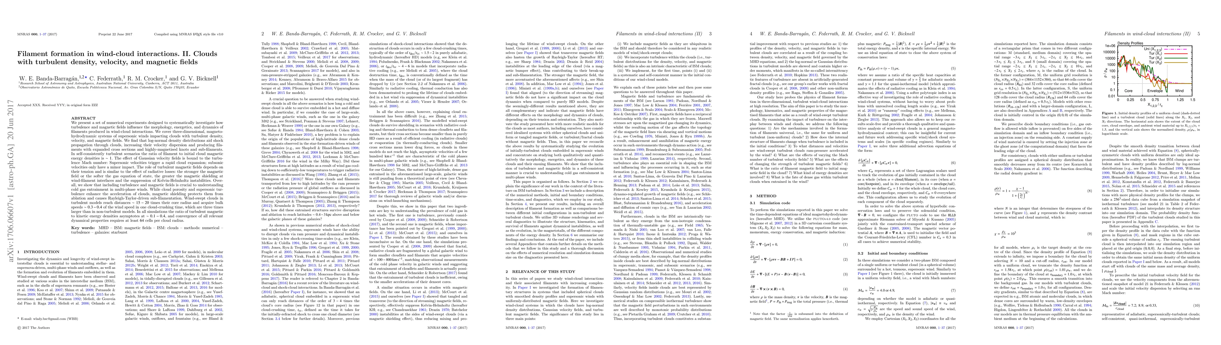 This paper explores how turbulence and magnetic fields affect filament formation in wind-cloud interactions through numerical simulations. It finds that log-normal density distributions enhance shock propagation and produce larger, more complex filaments, while magnetic fields suppress instabilities and protect clouds from ablation.