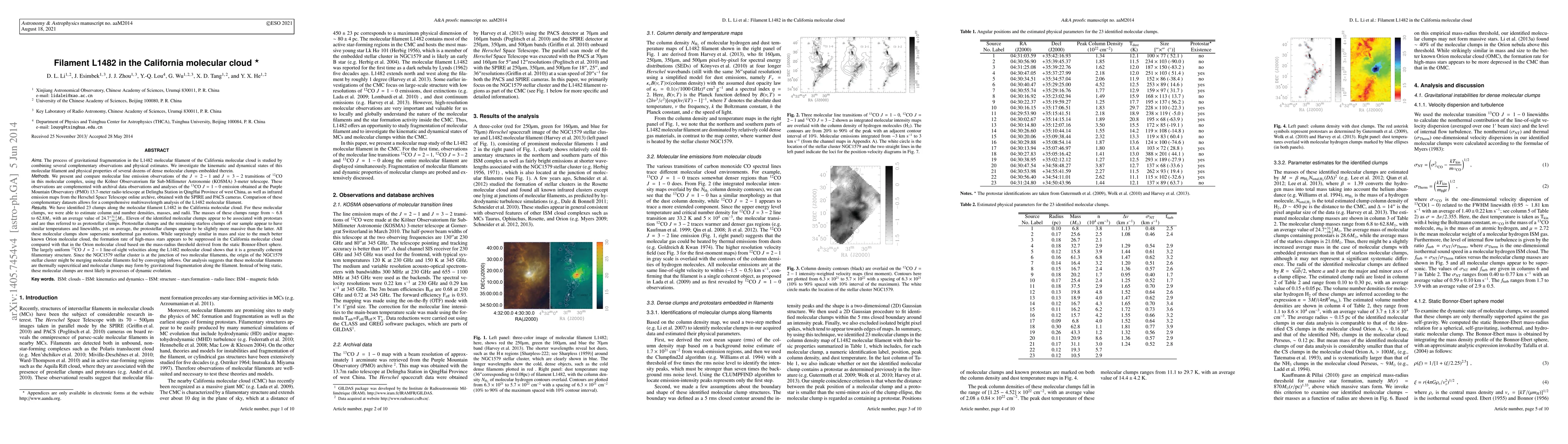 Aims. The process of gravitational fragmentation in the L1482 molecular filament of the California molecular cloud is studied by combining several complementary observations and physical estimates. We investigate the kinematic and dynamical states of this molecular filament and physical properties of several dozens of dense molecular clumps embedded therein. Methods. We present and compare molecular line emission observations of the J=2--1 and J=3--2 transitions of 12CO in this molecular complex, using the KOSMA 3-meter telescope. These observations are complemented with archival data observations and analyses of the 13CO J=1--0 emission obtained at the Purple Mountain Observatory 13.7-meter radio telescope at Delingha Station in QingHai Province of west China, as well as infrared emission maps from the Herschel Space Telescope online archive, obtained with the SPIRE and PACS cameras. Comparison of these complementary datasets allow for a comprehensive multi-wavelength analysis of the L1482 molecular filament. Results. We have identified 23 clumps along the molecular filament L1482 in the California molecular cloud. All these molecular clumps show supersonic non-thermal gas motions. While surprisingly similar in mass and size to the much better known Orion molecular cloud, the formation rate of high-mass stars appears to be suppressed in the California molecular cloud relative to that in the Orion molecular cloud based on the mass-radius threshold derived from the static Bonnor Ebert sphere. Our analysis suggests that these molecular filaments are thermally supercritical and molecular clumps may form by gravitational fragmentation along the filament. Instead of being static, these molecular clumps are most likely in processes of dynamic evolution.