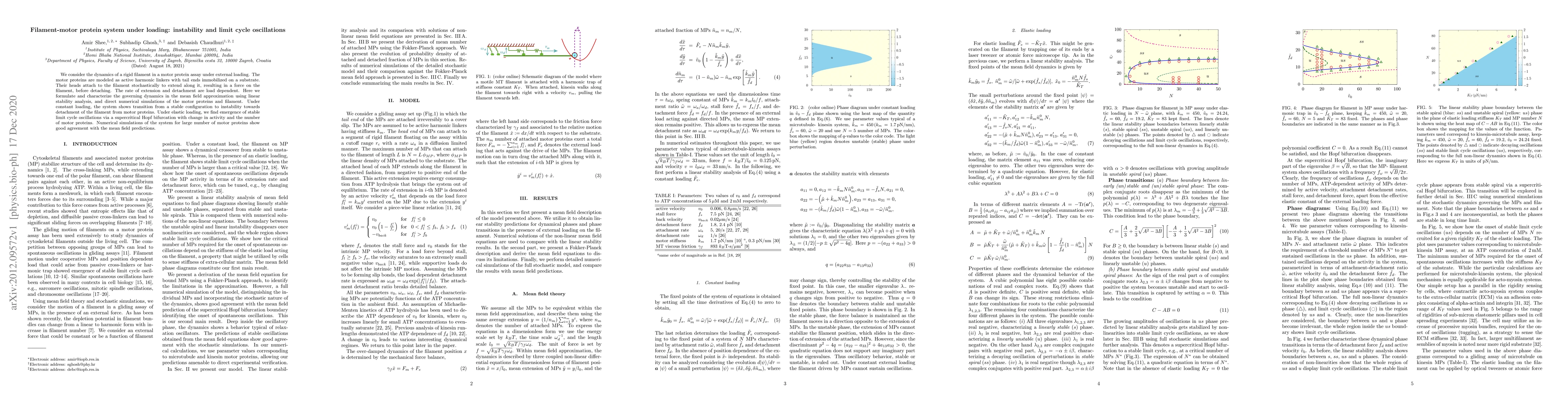 This paper investigates the dynamics of a rigid filament driven by motor proteins under external loading, revealing transitions from stable to unstable configurations and the emergence of stable limit cycle oscillations via a Hopf bifurcation under elastic loading. Numerical simulations corroborate mean field predictions.