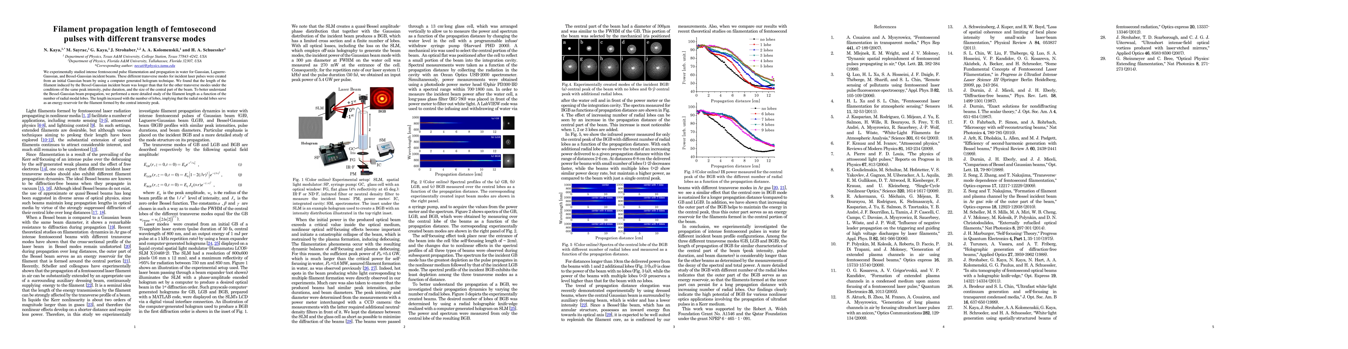 This study experimentally investigates femtosecond pulse filamentation in water with Gaussian, Laguerre-Gaussian, and Bessel-Gaussian beams, finding that Bessel-Gaussian beams produce longer filaments than other modes under identical conditions. The filament length increases with the number of radial modal lobes, indicating that these lobes act as an energy reservoir for the filament.