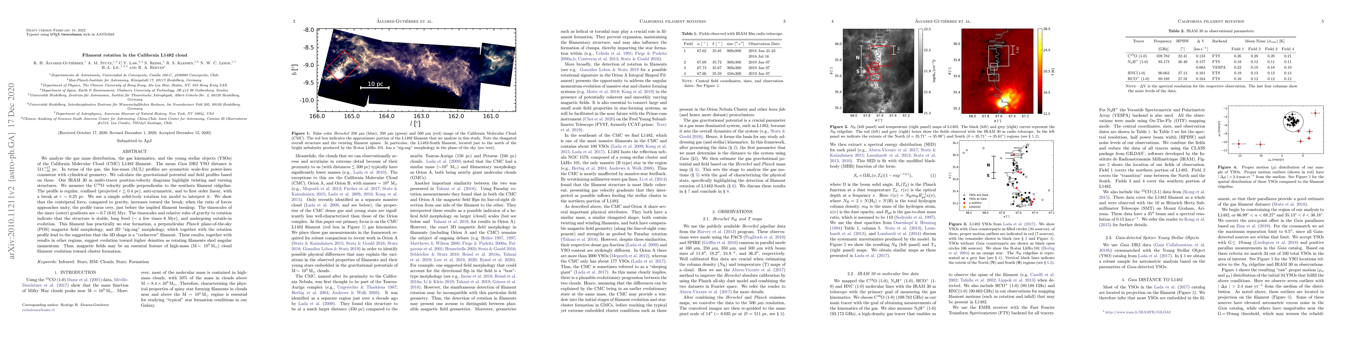We analyze the gas mass distribution, the gas kinematics, and the young stellar object (YSO) content of the California Molecular Cloud (CMC) L1482 filament. We derive a Gaia DR2 YSO distance of 511$^{+17}_{-16}$ pc. We derive scale-free power-laws for the mean gas line-mass (M/L) profiles; we calculate the gravitational potential and field profiles consistent with these. We present IRAM 30 m C$^{18}$O (1-0) (and other tracers) position-velocity (PV) diagrams that exhibit complex velocity twisting and turning structures. We find a rotational profile in C$^{18}$O perpendicular to the southern filament ridgeline. The profile is regular, confined ($r\lesssim0.4$ pc), anti-symmetric, and to first order linear with a break at $r\sim0.25$ pc. The timescales of the inner (outer) gradients are $\sim$0.7 (6.0) Myr. We show that the centripetal force, compared to gravity, increases toward the break; when the ratio of forces approaches unity, the profile turns over, just before filament breakup is achieved. The timescales and relative roles of gravity to rotation indicate that the structure is stable, long lived ($\sim$ a few times 6 Myr), and undergoing outside-in evolution. Moreover, this filament has practically no star formation, a perpendicular Planck plane-of-the-sky (POS) magnetic field morphology, and POS "zig-zag" morphology, which together with the rotation profile lead to the suggestion that the 3D shape is a corkscrew filament with a helical magnetic field. These results, combined with results in Orion and G035.39-00.33, suggest evolution toward higher densities as rotating filaments shed angular momentum. Thus, magnetic fields may be an essential feature of high-mass (M $\sim10^5$ M$_{\odot}$) cloud filament evolution toward cluster formation.
