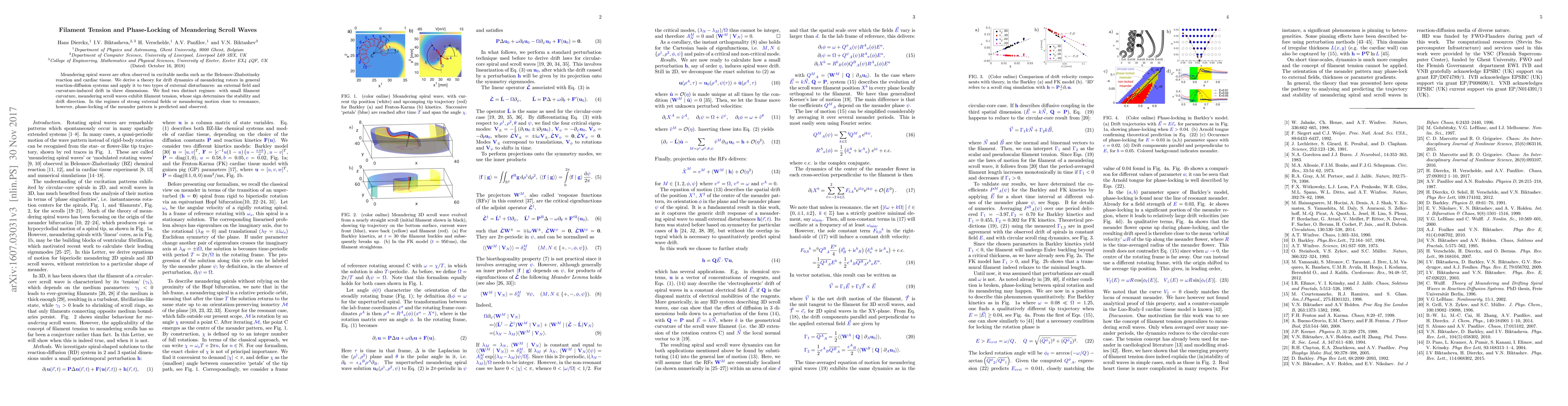 This paper investigates the dynamics of meandering scroll waves, revealing that filament tension dominates their behavior when averaged over the meander cycle. However, strong curvature or medium thickness gradients lead to phase-locked drift instead, as demonstrated through computational models of cycloidal meander and cardiac tissue.
