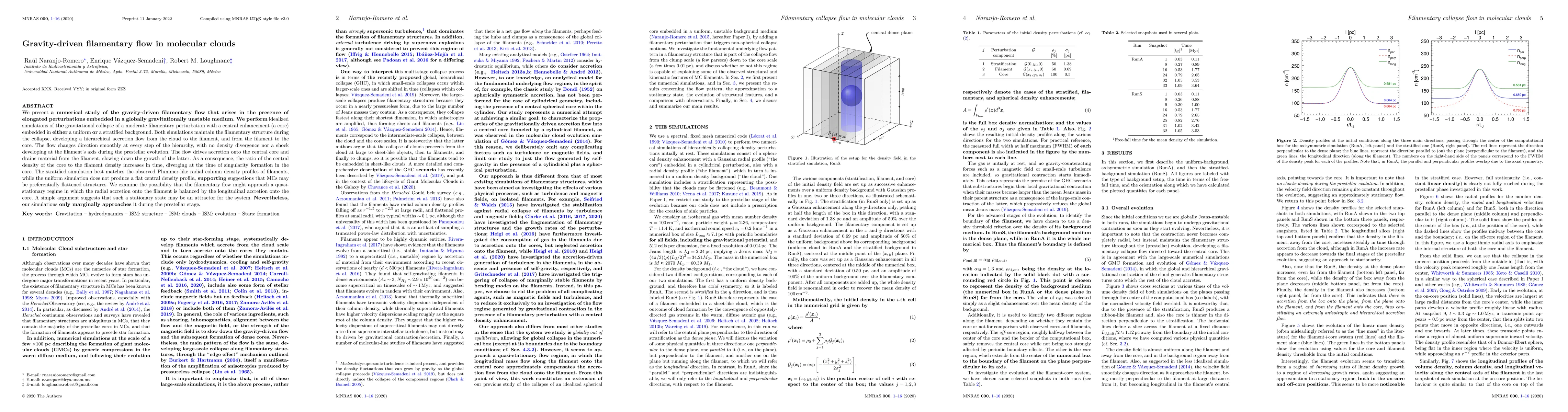 We present idealized numerical simulations of prestellar gravitational collapse of a moderate initial filamentary perturbation with an additional central ellipsoidal enhancement (a core) considering a uniform, and a stratified background, the latter representing flattened clouds. Both simulations maintain the filamentary structure during the collapse, developing a hierarchical accretion flow from the cloud to the plane; from there to the filament, and from the filament to the core. The flow changes direction smoothly at every step of the hierarchy, with no density divergence nor a shock developing at the filament's axis during the studied prestellar evolution. The flow drives accretion onto the central core and drains material from the filament, slowing down the growth of the latter. As a consequence, the ratio of the central density of the core to the filament density increases in time, diverging at the time of singularity formation in the core. The stratified simulation produces the best match for observed Plummer-like radial column density profiles of filaments, while the uniform simulation does not produce a flat central density profile. This result supports recent suggestions that MCs may be preferentially flattened structures. We examine the possibility that the filamentary flow might approach a quasi-stationary regime in which the radial accretion onto the filament is balanced by the longitudinal accretion onto the core. A simple argument suggests that such a stationary state may be an attractor for the system. Our simulations, do not attain this stationary stage, but appear to be approaching it during the prestellar stage.
