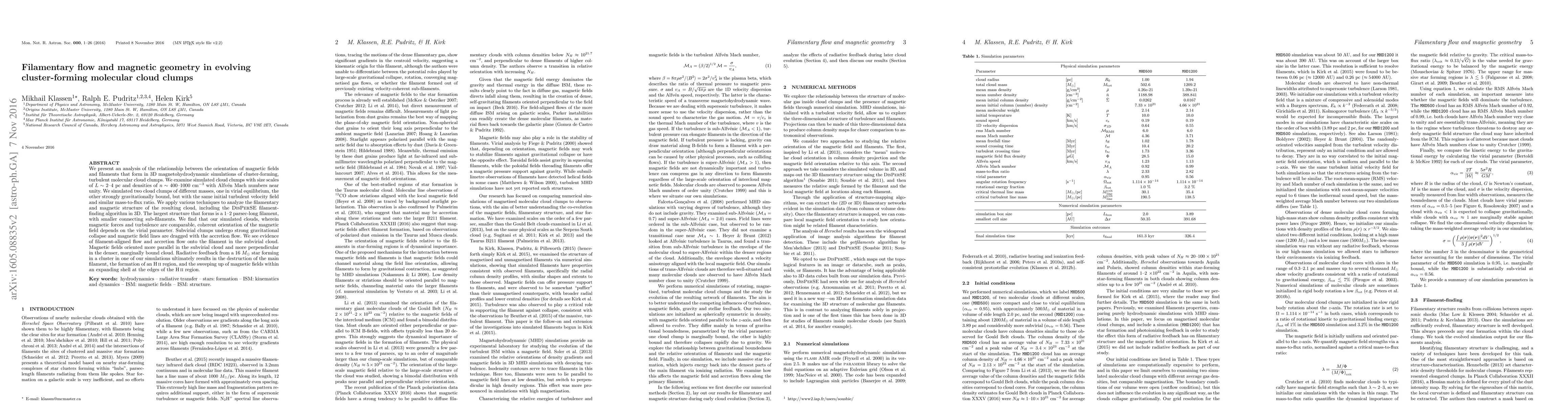 We present an analysis of the relationship between the orientation of magnetic fields and filaments that form in 3D magnetohydrodynamic simulations of cluster-forming, turbulent molecular cloud clumps. We examine simulated cloud clumps with size scales of L ~ 2-4 pc and densities of n ~ 400-1000 cm^-3 with Alfven Mach numbers near unity. We simulated two cloud clumps of different masses, one in virial equilibrium, the other strongly gravitationally bound, but with the same initial turbulent velocity field and similar mass-to-flux ratio. We apply various techniques to analyze the filamentary and magnetic structure of the resulting cloud, including the DisPerSE filament-finding algorithm in 3D. The largest structure that forms is a 1-2 parsec-long filament, with smaller connecting sub-filaments. We find that our simulated clouds, wherein magnetic forces and turbulence are comparable, coherent orientation of the magnetic field depends on the virial parameter. Subvirial clumps undergo strong gravitational collapse and magnetic field lines are dragged with the accretion flow. We see evidence of filament-aligned flow and accretion flow onto the filament in the subvirial cloud. Magnetic fields oriented more parallel in the subvirial cloud and more perpendicular in the denser, marginally bound cloud. Radiative feedback from a 16 Msun star forming in a cluster in one of our simulations ultimately results in the destruction of the main filament, the formation of an HII region, and the sweeping up of magnetic fields within an expanding shell at the edges of the HII region.