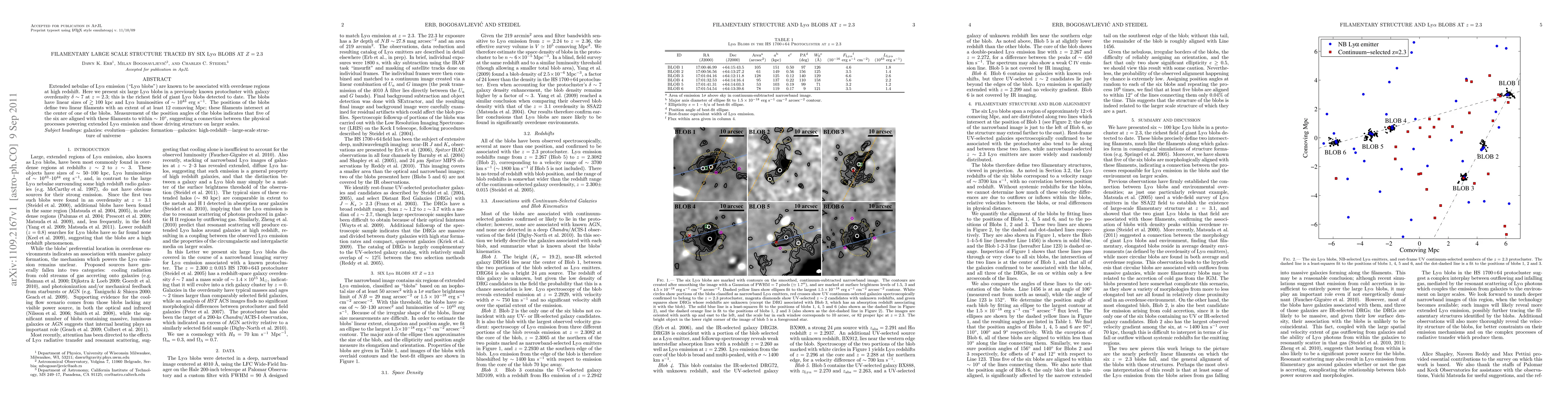 This study identifies six large Ly-alpha emission blobs in a protocluster at z=2.3, revealing two intersecting filaments spanning at least 12 comoving Mpc, suggesting a link between Ly-alpha emission and large-scale structure formation. The alignment of five blobs with these filaments indicates a common physical process driving both phenomena.