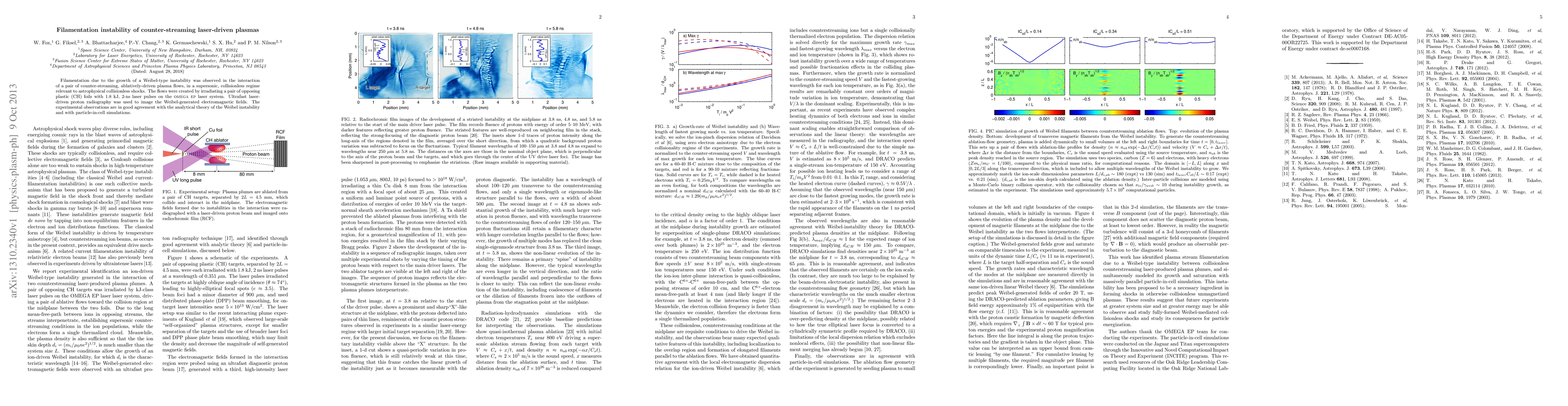 This study observes filamentation in counter-streaming laser-driven plasmas due to a Weibel-type instability, relevant to astrophysical shocks. Experiments on the OMEGA EP laser system confirm the instability's growth and electromagnetic field generation, aligning with theoretical predictions and simulations.