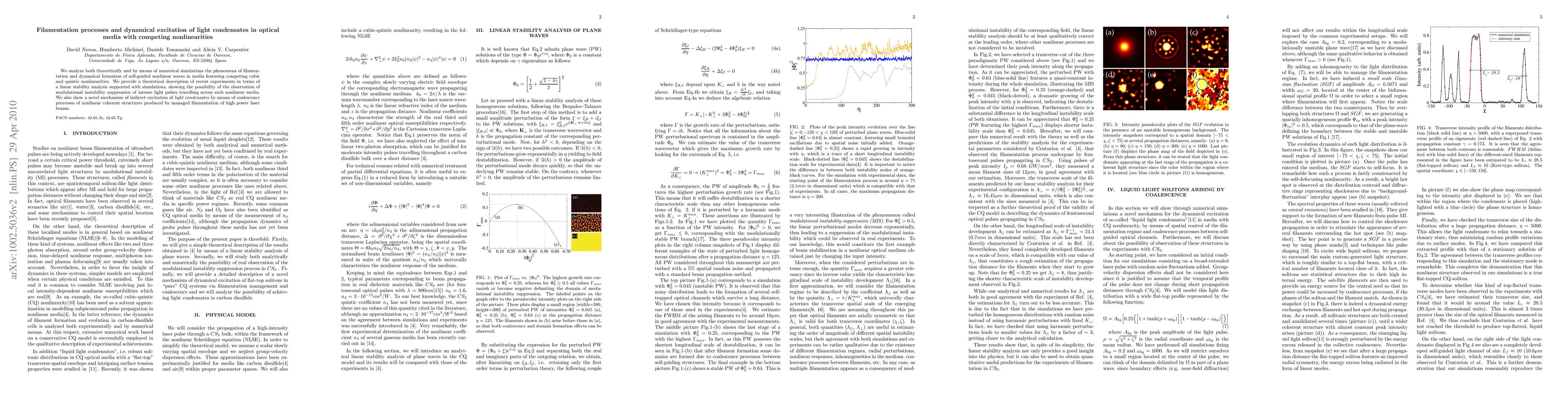 We analyze both theoretically and by means of numerical simulations the phenomena of filamentation and dynamical formation of self-guided nonlinear waves in media featuring competing cubic and quintic nonlinearities. We provide a theoretical description of recent experiments in terms of a linear stability analysis supported with simulations, showing the possibility of experimental observation of the modulational instability suppression of intense light pulses travelling across such nonlinear media. We also show a novel mechanism of indirect excitation of {\em light condensates} by means of coalescence processes of nonlinear coherent structures produced by managed filamentation of high power laser beams.