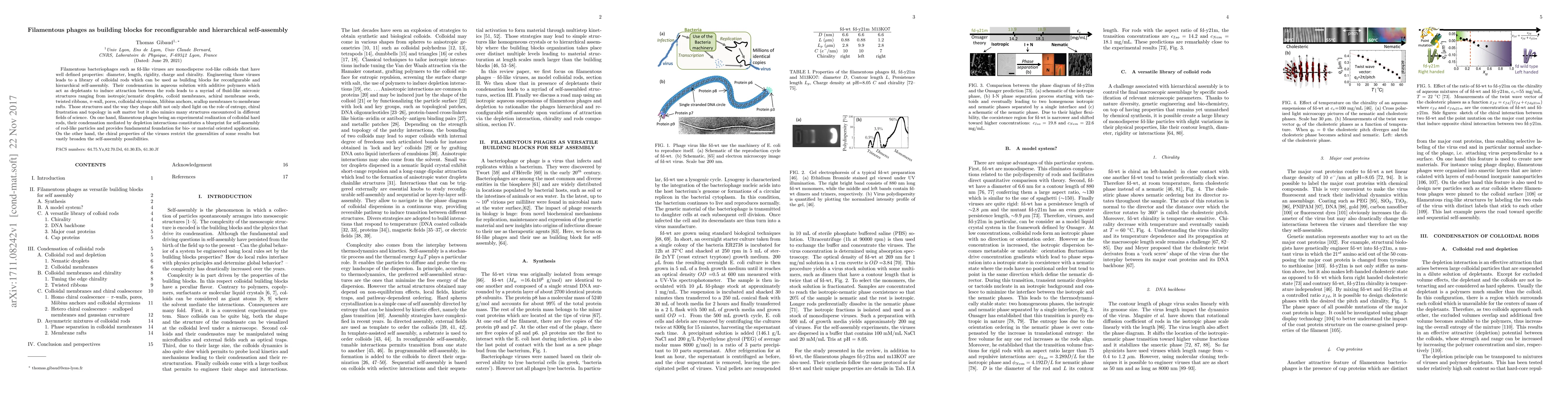 Filamentous bacteriophages such as fd-like viruses are monodisperse rod-like colloids that have well defined properties: diameter, length, rigidity, charge and chirality. Engineering those viruses leads to a library of colloidal rods which can be used as building blocks for reconfigurable and hierarchical self-assembly. Their condensation in aqueous solution \th{with additive polymers which act as depletants to induce} attraction between the rods leads to a myriad of fluid-like micronic structures ranging from isotropic/nematic droplets, colloid membranes, achiral membrane seeds, twisted ribbons, $\pi$-wall, pores, colloidal skyrmions, M\"obius anchors, scallop membranes to membrane rafts. Those structures and the way they shape shift not only shed light on the role of entropy, chiral frustration and topology in soft matter but it also mimics many structures encountered in different fields of science. On one hand, filamentous phages being an experimental realization of colloidal hard rods, their condensation mediated by depletion interactions constitutes a blueprint for self-assembly of rod-like particles and provides fundamental foundation for bio- or material oriented applications. On the other hand, the chiral properties of the viruses restrict the generalities of some results but vastly broaden the self-assembly possibilities.