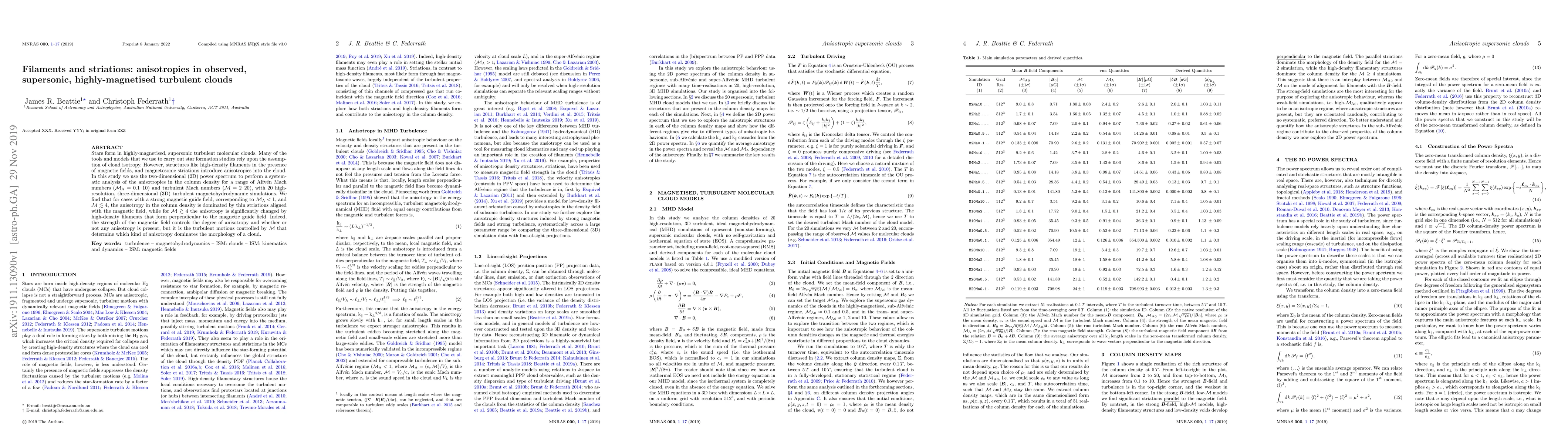 This study investigates anisotropies in highly-magnetised, supersonic turbulent molecular clouds using 2D power spectra and 3D simulations. It reveals that thin striations aligned with magnetic fields dominate anisotropies at low Alfv\'en Mach numbers, while high-density filaments form and dominate at higher turbulent Mach numbers.