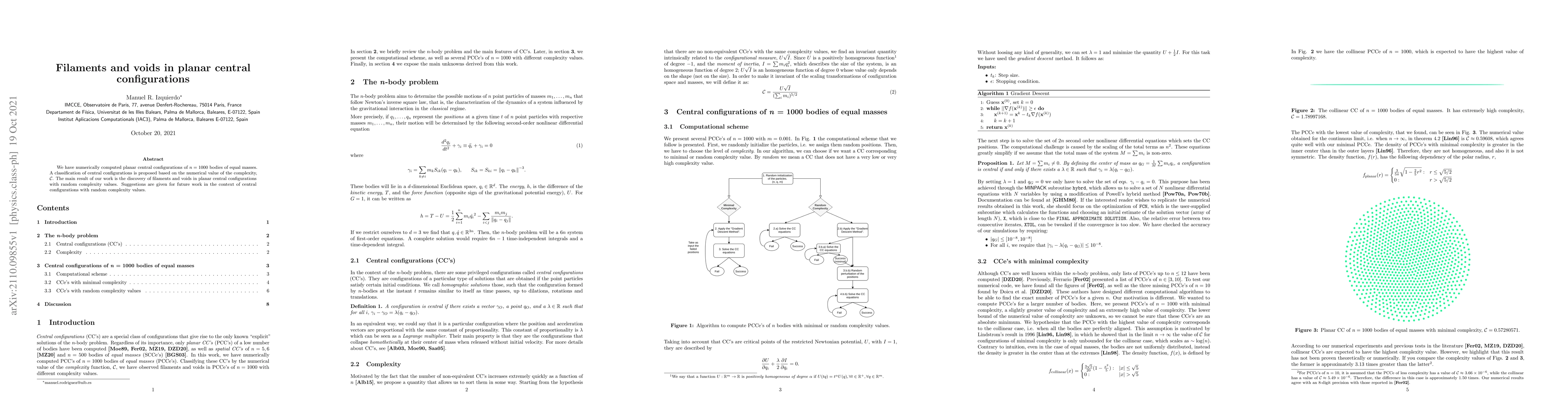 We have numerically computed planar central configurations of $n=1000$ bodies of equal masses. A classification of central configurations is proposed based on the numerical value of the complexity, $\mathcal{C}$. The main result of our work is the discovery of filaments and voids in planar central configurations with random complexity values. Suggestions are given for future work in the context of central configurations with random complexity values.