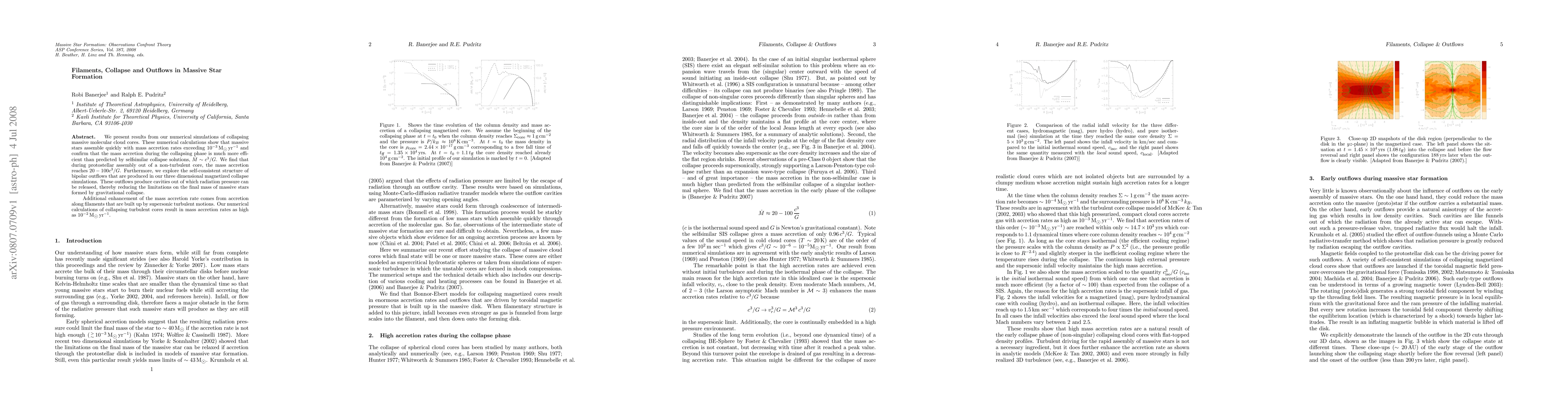 We present results from our numerical simulations of collapsing massive molecular cloud cores. These numerical calculations show that massive stars assemble quickly with mass accretion rates exceeding 10^-3 Msol/yr and confirm that the mass accretion during the collapsing phase is much more efficient than predicted by selfsimilar collapse solutions, dM/dt ~ c^3/G. We find that during protostellar assembly out of a non-turbulent core, the mass accretion reaches 20 - 100 c^3/G. Furthermore, we explore the self-consistent structure of bipolar outflows that are produced in our three dimensional magnetized collapse simulations. These outflows produce cavities out of which radiation pressure can be released, thereby reducing the limitations on the final mass of massive stars formed by gravitational collapse. Additional enhancement of the mass accretion rate comes from accretion along filaments that are built up by supersonic turbulent motions. Our numerical calculations of collapsing turbulent cores result in mass accretion rates as high as 10^-2 Msol/yr.