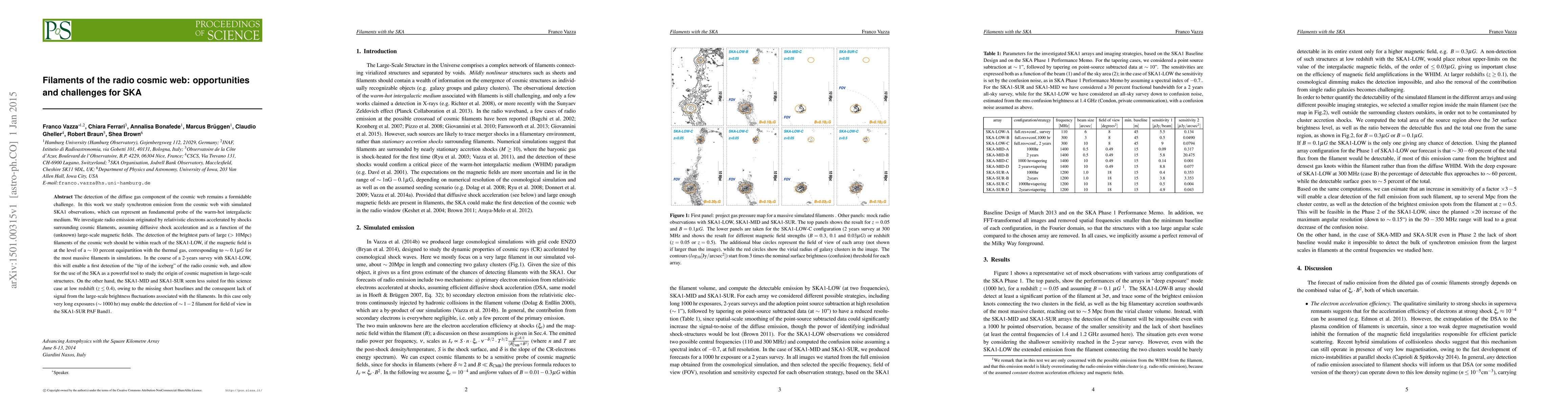 This paper explores the potential of the SKA1-LOW to detect synchrotron emission from cosmic filaments in the radio cosmic web, indicating that it could reveal the warm-hot intergalactic medium. However, SKA1-MID and SKA1-SUR face challenges in detecting these emissions due to the lack of short baselines and large-scale brightness fluctuations.