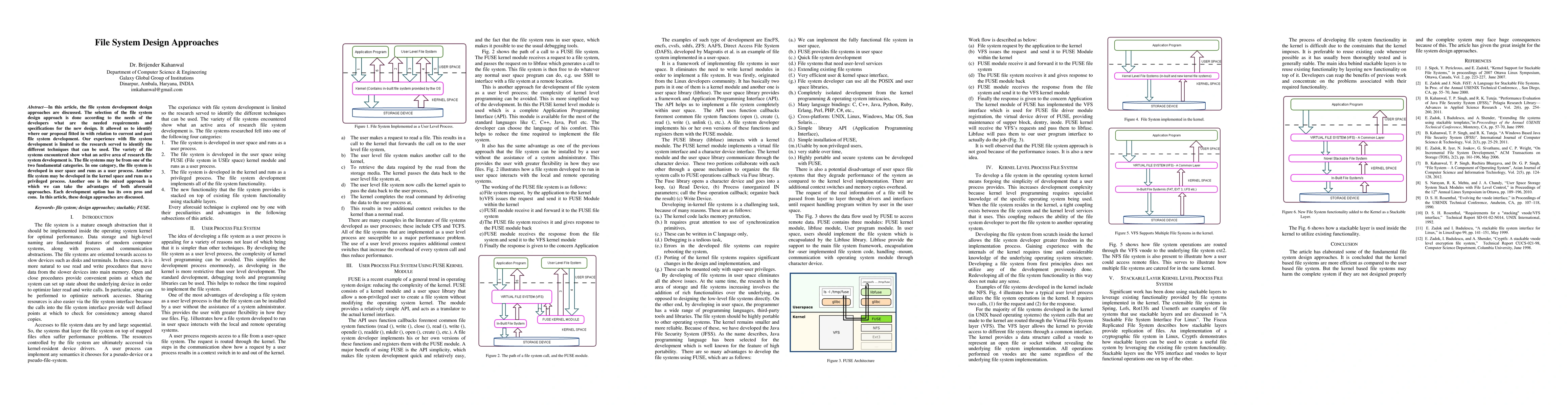 This paper explores various design approaches for file system development, categorizing them into user space, kernel space, and mixed approaches. It discusses the advantages and disadvantages of each method, highlighting the active research in this field.