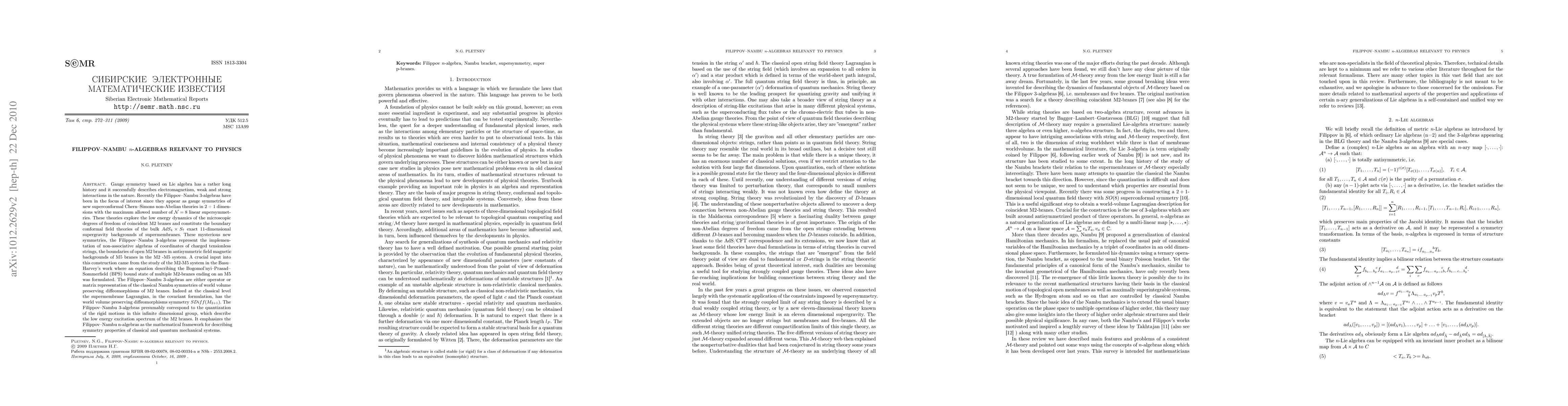Gauge symmetry based on Lie algebra has a rather long history and it successfully describes electromagnetism, weak and strong interactions in the nature. Recently the Filippov-Nambu 3-algebras have been in the focus of interest since they appear as gauge symmetries of new superconformal Chern-Simons non-Abelian theories in 2 + 1 dimensions with the maximum allowed number of N = 8 linear supersymmetries. These theories explore the low energy dynamics of the microscopic degrees of freedom of coincident M2 branes and constitute the boundary conformal field theories of the bulk AdS4 / S7 exact 11-dimensional supergravity backgrounds of supermembranes. These mysterious new symmetries, the Filippov-Nambu 3-algebras represent the implementation of non-associative algebras of coordinates of charged tensionless strings, the boundaries of open M2 branes in antisymmetric field magnetic backgrounds of M5 branes in the M2 -M5 system. A crucial input into this construction came from the study of the M2-M5 system in the Basu- Harvey's work where an equation describing the Bogomol'nyi-Prasad- Sommerfeld (BPS) bound state of multiple M2-branes ending on an M5 was formulated. The Filippov-Nambu 3-algebras are either operator or matrix representation of the classical Nambu symmetries of world volume preserving diffeomorphisms of M2 branes. Indeed at the classical level the supermembrane Lagrangian, in the covariant formulation, has the world volume preserving diffeomorphisms symmetry SDiff(M2+1). The Filippov-Nambu 3-algebras presumably correspond to the quantization of the rigid motions in this infinite dimensional group, which describe the low energy excitation spectrum of the M2 branes. It emphasizes the Filippov-Nambu n-algebras as the mathematical framework for describing symmetry properties of classical and quantum mechanical systems.