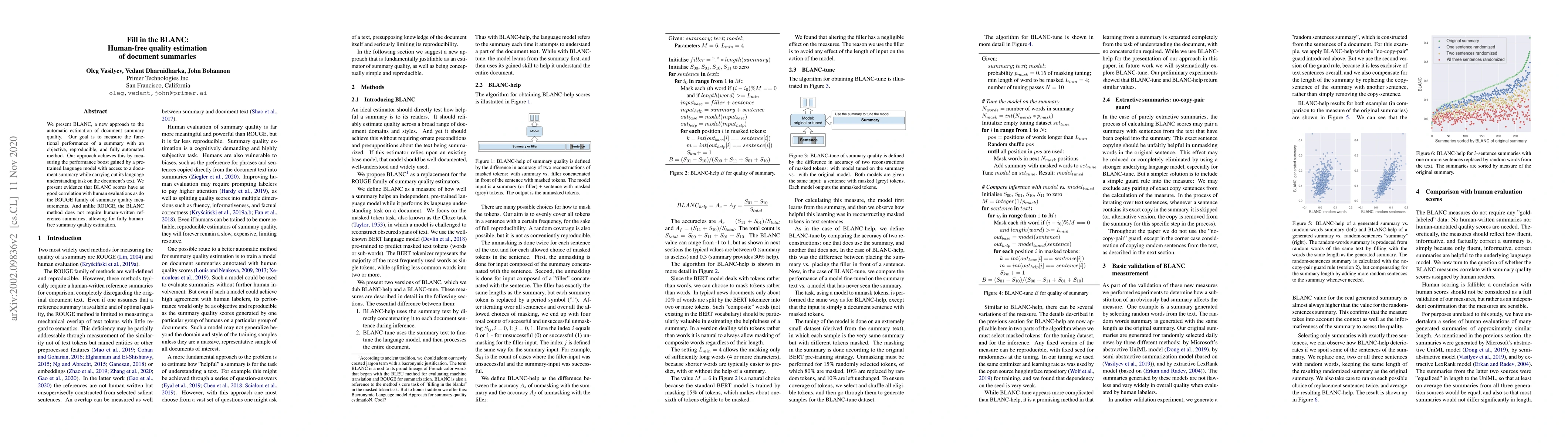 A new approach called BLANC measures summary quality by boosting a language model with a document summary, achieving comparable correlation to human evaluations without requiring reference summaries.