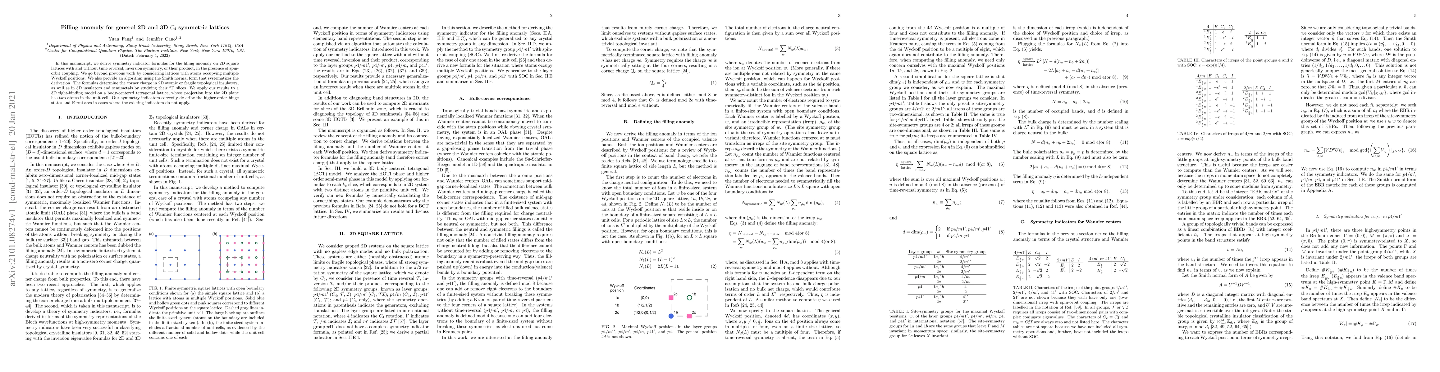 In this manuscript, we derive symmetry indicator formulas for the filling anomaly on 2D square lattices with and without time reversal, inversion symmetry, or their product, in the presence of spin-orbit coupling. We go beyond previous work by considering lattices with atoms occupying multiple Wyckoff positions. We also provide an algorithm using the Smith normal form that systematizes the derivation. The formulas determine the corner charge in 2D atomic or fragile topological insulators, as well as in 3D insulators and semimetals by studying their 2D slices. We apply our results to a 3D tight-binding model on a body-centered tetragonal lattice, whose projection into the 2D plane has two atoms in the unit cell. Our symmetry indicators correctly describe the higher-order hinge states and Fermi arcs in cases where the existing indicators do not apply.