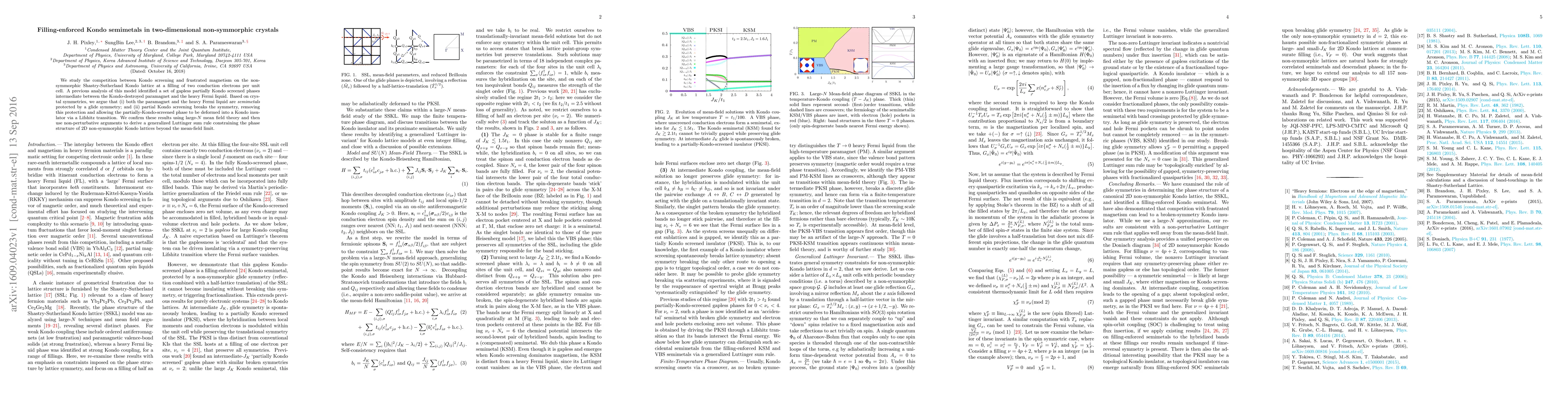 We study the competition between Kondo screening and frustrated magnetism on the non-symmorphic Shastry-Sutherland Kondo lattice at a filling of two conduction electrons per unit cell. A previous analysis of this model identified a set of gapless partially Kondo screened phases intermediate between the Kondo-destroyed paramagnet and the heavy Fermi liquid. Based on crystal symmetries, we argue that (i)~both the paramagnet and the heavy Fermi liquid are {\it semimetals} protected by a glide symmetry; and (ii)~partial Kondo screening breaks the symmetry, removing this protection and allowing the partially-Kondo-screened phase to be deformed into a Kondo insulator via a Lifshitz transition. We confirm these results using large-$N$ mean field theory and then use non-perturbative arguments to derive a generalized Luttinger sum rule constraining the phase structure of 2D non-symmorphic Kondo lattices beyond the mean-field limit.