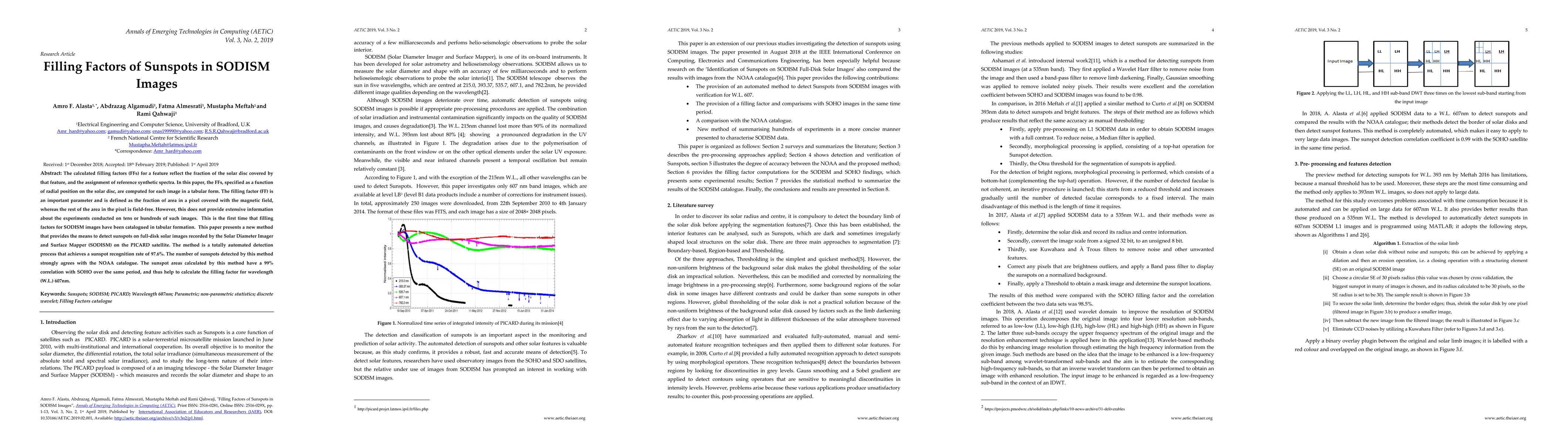 Received: 1st December 2018; Accepted: 18th February 2019; Published: 1st April 2019 Abstract: The calculated filling factors (FFs) for a feature reflect the fraction of the solar disc covered by that feature, and the assignment of reference synthetic spectra. In this paper, the FFs, specified as a function of radial position on the solar disc, are computed for each image in a tabular form. The filling factor (FF) is an important parameter and is defined as the fraction of area in a pixel covered with the magnetic field, whereas the rest of the area in the pixel is field-free. However, this does not provide extensive information about the experiments conducted on tens or hundreds of such images. This is the first time that filling factors for SODISM images have been catalogued in tabular formation. This paper presents a new method that provides the means to detect sunspots on full-disk solar images recorded by the Solar Diameter Imager and Surface Mapper (SODISM) on the PICARD satellite. The method is a totally automated detection process that achieves a sunspot recognition rate of 97.6%. The number of sunspots detected by this method strongly agrees with the NOAA catalogue. The sunspot areas calculated by this method have a 99% correlation with SOHO over the same period, and thus help to calculate the filling factor for wavelength (W.L.) 607nm.