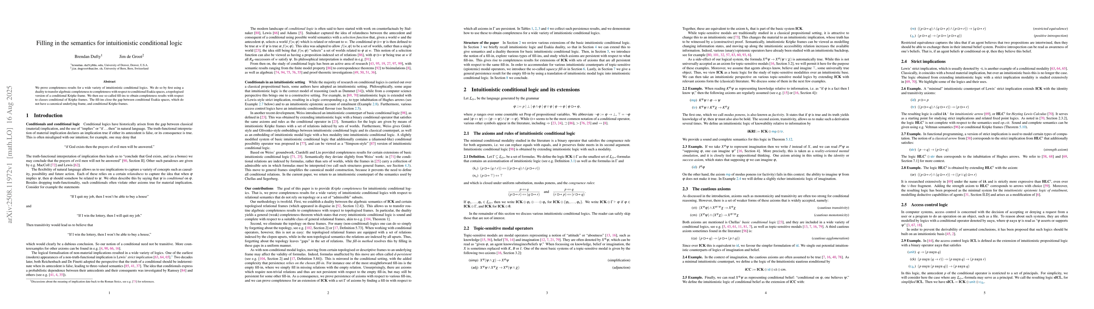 We prove completeness results for a wide variety of intuitionistic conditional logics. We do so by first using a duality to transfer algebraic completeness to completeness with respect to conditional Esakia spaces, a topologised version of a conditional Kripke frame. We then use so-called fill-ins to obtain completeness results with respect to classes conditional of Kripke frames. The fill-ins close the gap between conditional Esakia spaces, which do not have a canonical underlying frame, and conditional Kripke frames.