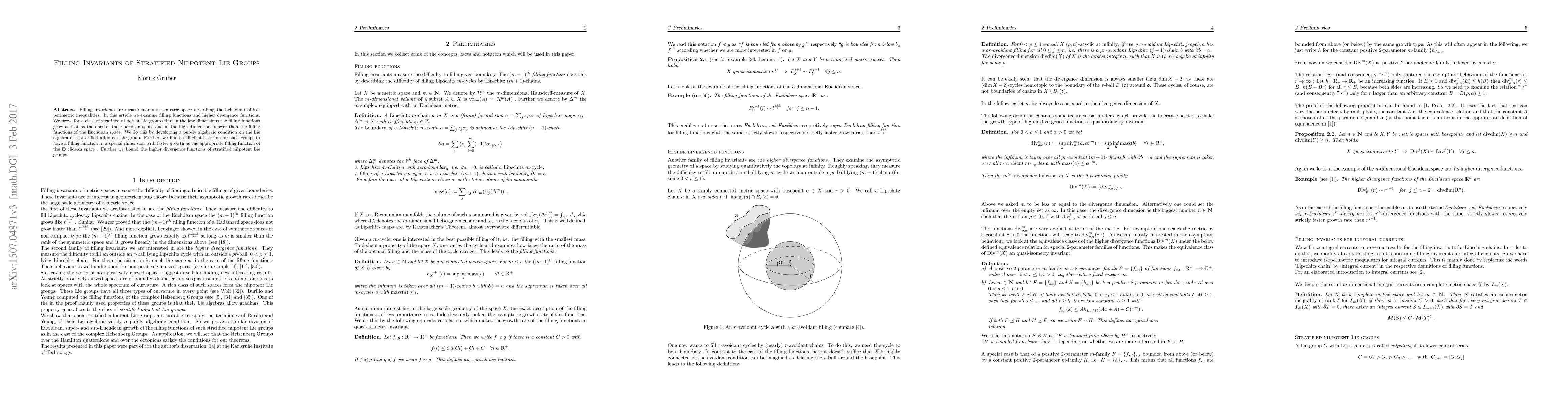 Filling invariants are measurements of a metric space describing the behaviour of isoperimetric inequalities. In this article we examine filling functions and higher divergence functions. We prove for a class of stratified nilpotent Lie groups that in the low dimensions the filling functions grow as fast as the ones of the Euclidean space and in the high dimensions slower than the filling functions of the Euclidean space. We do this by developing a purely algebraic condition on the Lie algebra of a stratified nilpotent Lie group. Further, we find a sufficient criterion for such groups to have a filling function in a special dimension with faster growth as the appropriate filling function of the Euclidean space. Further we bound the higher divergence functions of stratified nilpotent Lie groups.