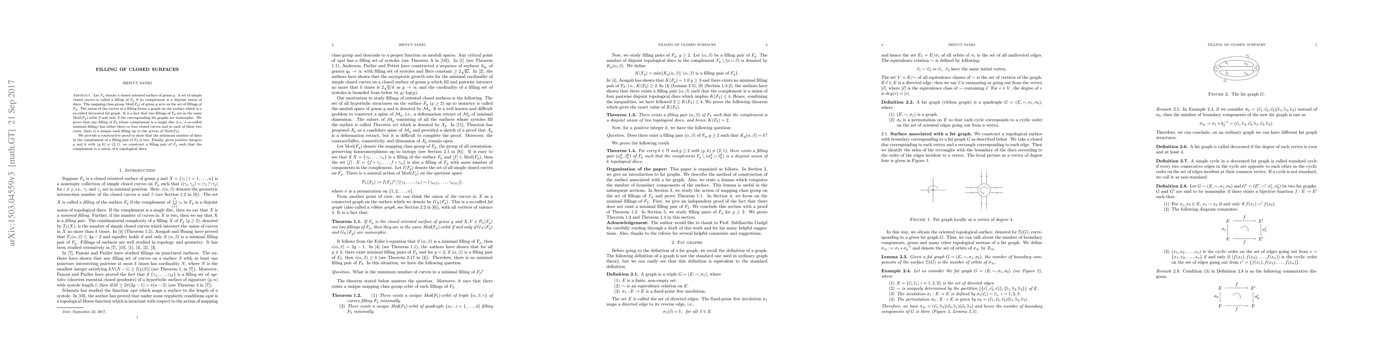 Let $F_g$ denote a closed oriented surface of genus $g$. A set of simple closed curves is called a filling of $F_g$ if its complement is a disjoint union of discs. The mapping class group $\text{Mod}(F_g)$ of genus $g$ acts on the set of fillings of $F_g$. The union of the curves in a filling forms a graph on the surface which is a so-called decorated fat graph. It is a fact that two fillings of $F_g$ are in the same $\text{Mod}(F_g)$-orbit if and only if the corresponding fat graphs are isomorphic. We prove that any filling of $F_2$ whose complement is a single disc (i.e., a so-called minimal filling) has either three or four closed curves and in each of these two cases, there is a unique such filling up to the action of $\text{Mod}(F_2)$. We provide a constructive proof to show that the minimum number of discs in the complement of a filling pair of $F_2$ is two. Finally, given positive integers $g$ and $k$ with $(g, k)\neq (2, 1)$, we construct a filling pair of $F_g$ such that the complement is a union of $k$ topological discs.
