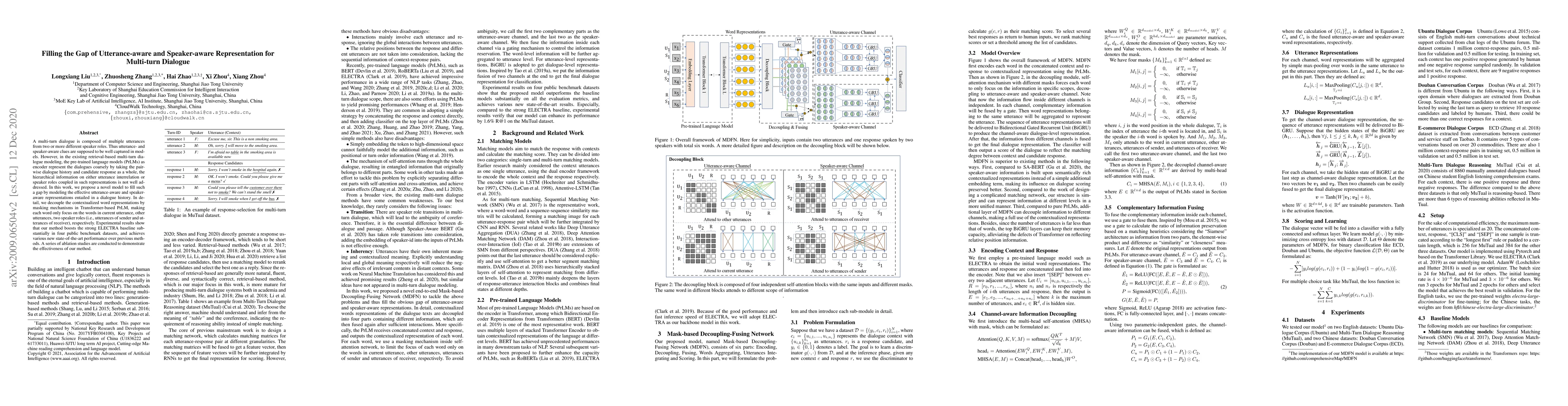 This paper proposes a novel model to enhance multi-turn dialogue systems by capturing utterance-aware and speaker-aware representations through a Transformer-based pre-trained language model with masking mechanisms. Experimental results show significant improvements over the ELECTRA baseline and achieve state-of-the-art performance on benchmark datasets.