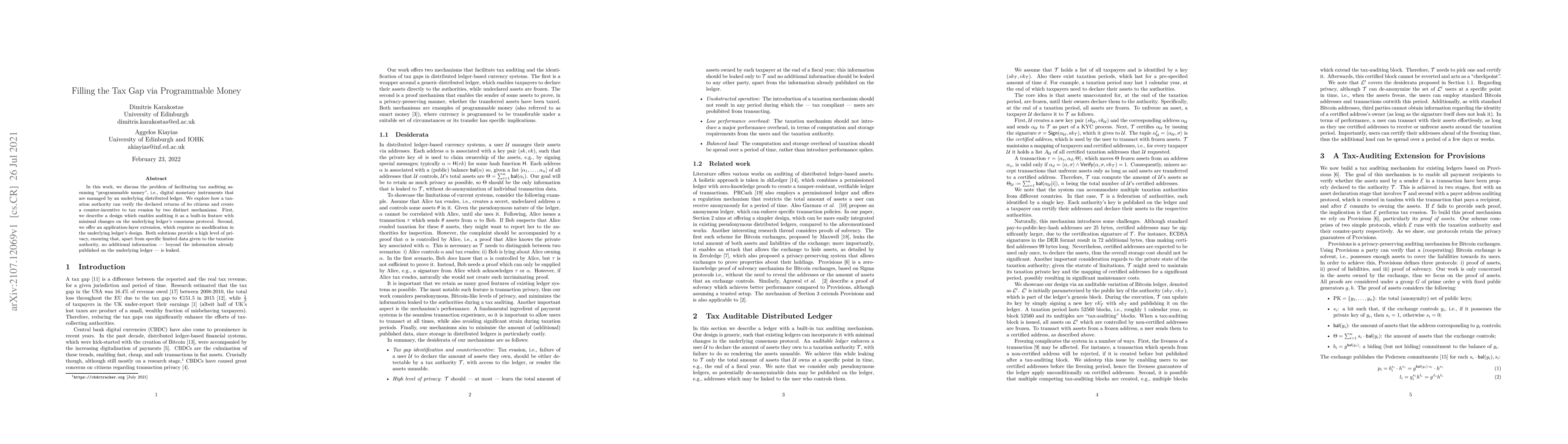 We discuss the problem of facilitating tax auditing assuming "programmable money", i.e., digital monetary instruments that are managed by an underlying distributed ledger. We explore how a taxation authority can verify the declared returns of its citizens and create a counter-incentive to tax evasion by two distinct mechanisms. First, we describe a design which enables auditing it as a built-in feature with minimal changes on the underlying ledger's consensus protocol. Second, we offer an application-layer extension, which requires no modification in the underlying ledger's design. Both solutions provide a high level of privacy, ensuring that, apart from specific limited data given to the taxation authority, no additional information - beyond the information already published on the underlying ledger - is leaked.