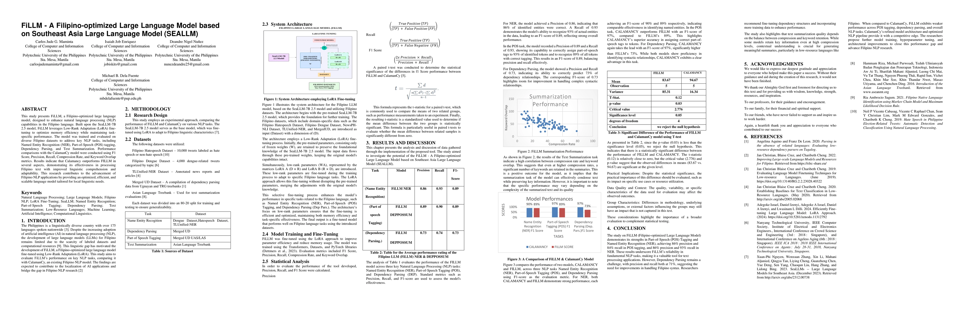 The development of FiLLM, a Filipino-optimized large language model using LoRA fine-tuning for efficient memory usage and task-specific performance.