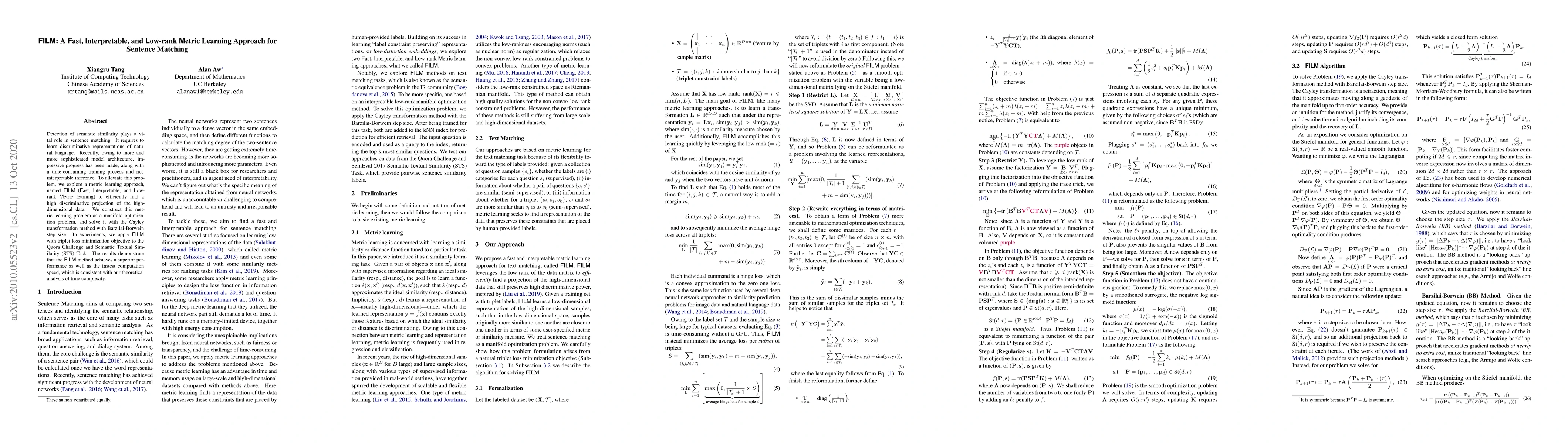Detection of semantic similarity plays a vital role in sentence matching. It requires to learn discriminative representations of natural language. Recently, owing to more and more sophisticated model architecture, impressive progress has been made, along with a time-consuming training process and not-interpretable inference. To alleviate this problem, we explore a metric learning approach, named FILM (Fast, Interpretable, and Low-rank Metric learning) to efficiently find a high discriminative projection of the high-dimensional data. We construct this metric learning problem as a manifold optimization problem and solve it with the Cayley transformation method with the Barzilai-Borwein step size. In experiments, we apply FILM with triplet loss minimization objective to the Quora Challenge and Semantic Textual Similarity (STS) Task. The results demonstrate that the FILM method achieves superior performance as well as the fastest computation speed, which is consistent with our theoretical analysis of time complexity.