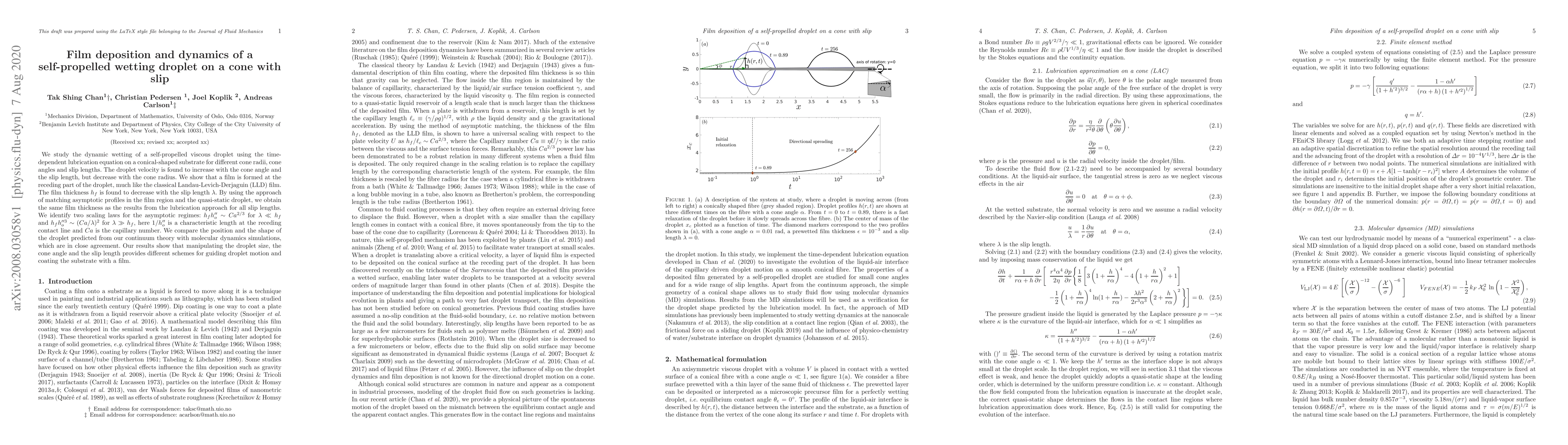 This paper investigates the dynamic wetting behavior of a self-propelled viscous droplet on a conical substrate, revealing that droplet velocity increases with cone angle and slip length but decreases with cone radius. It demonstrates the formation of a film similar to the LLD film at the receding droplet edge, with film thickness decreasing with the slip length.