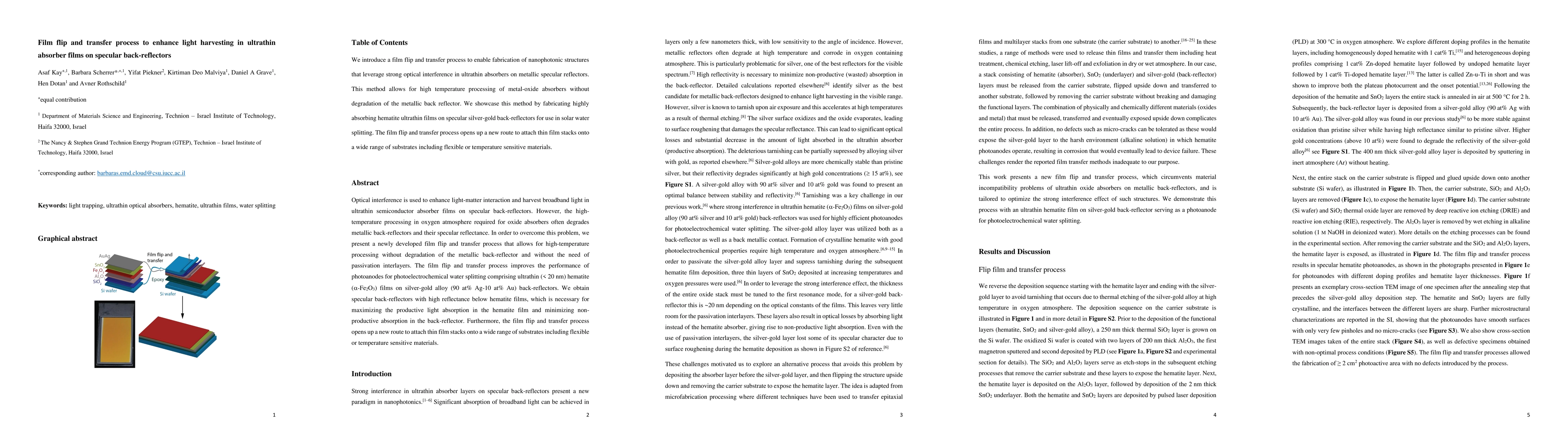 This paper introduces a film flip and transfer process to enhance light harvesting in ultrathin hematite films on specular back-reflectors, overcoming high-temperature processing issues without degrading the metallic reflectors, thus improving photoanode performance for water splitting. The method maintains high reflectance and enables attachment of thin film stacks onto various substrates.