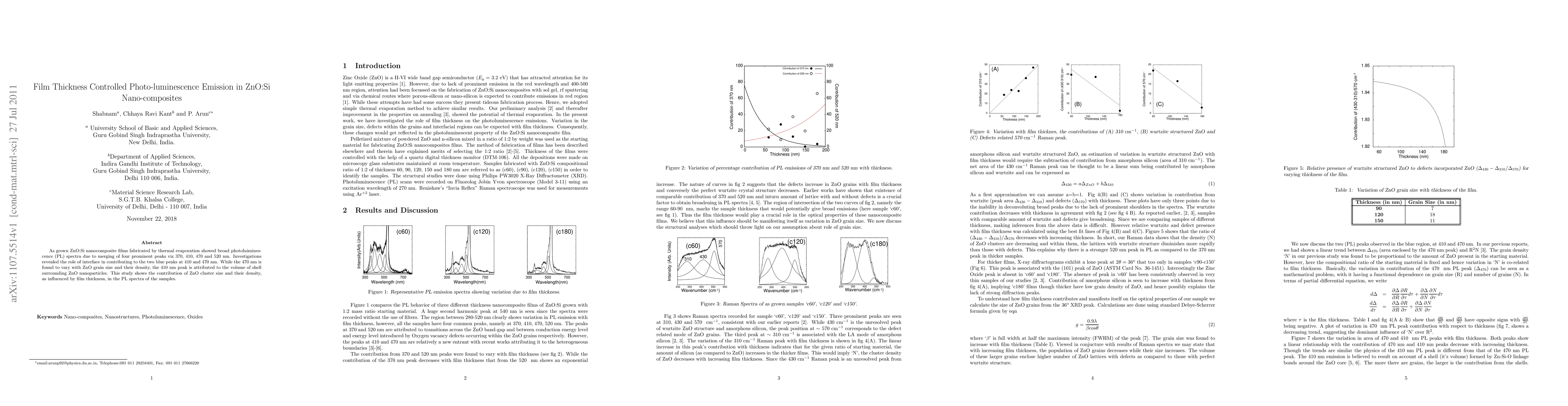 This study investigates ZnO:Si nanocomposite films, revealing that film thickness controls the photoluminescence emission through variations in ZnO cluster size and density, which affect the merging of four prominent peaks in the photoluminescence spectra. The interface contributes to two blue peaks, with the 410 nm peak linked to the shell volume surrounding ZnO nanoparticles.