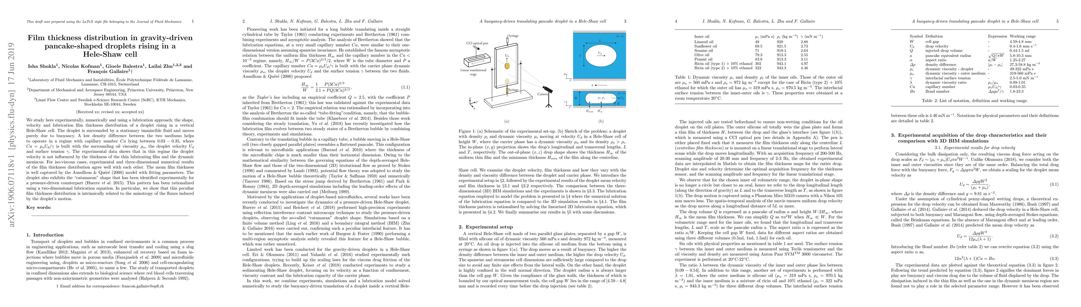 This study investigates the shape, velocity, and film thickness distribution of a rising pancake-shaped droplet in a Hele-Shaw cell using experimental, numerical, and lubrication approaches. The droplet's motion is driven by buoyancy, and the film thickness distribution is well captured by the Aussillous & Quéré model, revealing a "catamaran" shape linked to anisotropic fluxes.