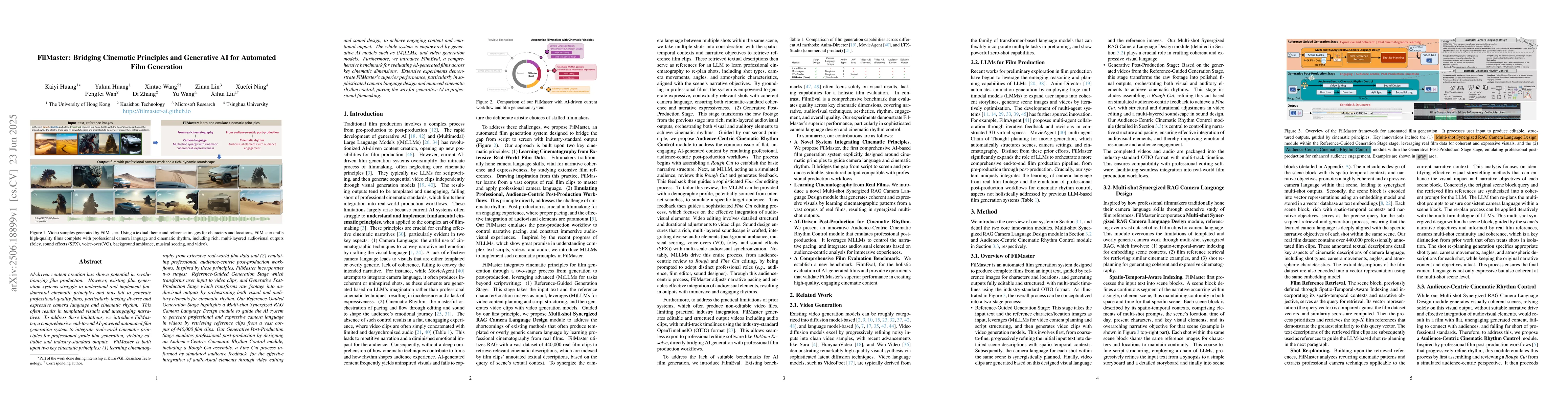AI-driven content creation has shown potential in film production. However, existing film generation systems struggle to implement cinematic principles and thus fail to generate professional-quality films, particularly lacking diverse camera language and cinematic rhythm. This results in templated visuals and unengaging narratives. To address this, we introduce FilMaster, an end-to-end AI system that integrates real-world cinematic principles for professional-grade film generation, yielding editable, industry-standard outputs. FilMaster is built on two key principles: (1) learning cinematography from extensive real-world film data and (2) emulating professional, audience-centric post-production workflows. Inspired by these principles, FilMaster incorporates two stages: a Reference-Guided Generation Stage which transforms user input to video clips, and a Generative Post-Production Stage which transforms raw footage into audiovisual outputs by orchestrating visual and auditory elements for cinematic rhythm. Our generation stage highlights a Multi-shot Synergized RAG Camera Language Design module to guide the AI in generating professional camera language by retrieving reference clips from a vast corpus of 440,000 film clips. Our post-production stage emulates professional workflows by designing an Audience-Centric Cinematic Rhythm Control module, including Rough Cut and Fine Cut processes informed by simulated audience feedback, for effective integration of audiovisual elements to achieve engaging content. The system is empowered by generative AI models like (M)LLMs and video generation models. Furthermore, we introduce FilmEval, a comprehensive benchmark for evaluating AI-generated films. Extensive experiments show FilMaster's superior performance in camera language design and cinematic rhythm control, advancing generative AI in professional filmmaking.