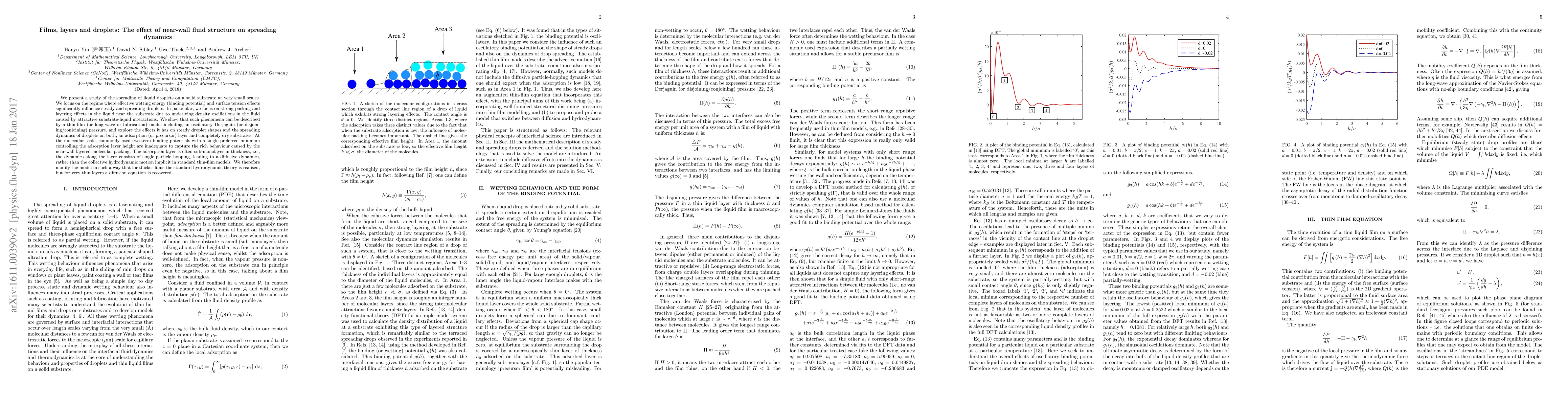 Researchers studied how liquid droplets spread on a surface, finding that near-wall fluid structure affects their behavior due to substrate-liquid interactions. They developed a new model to capture these effects, which reveals the importance of layering and diffusion in the spreading dynamics.