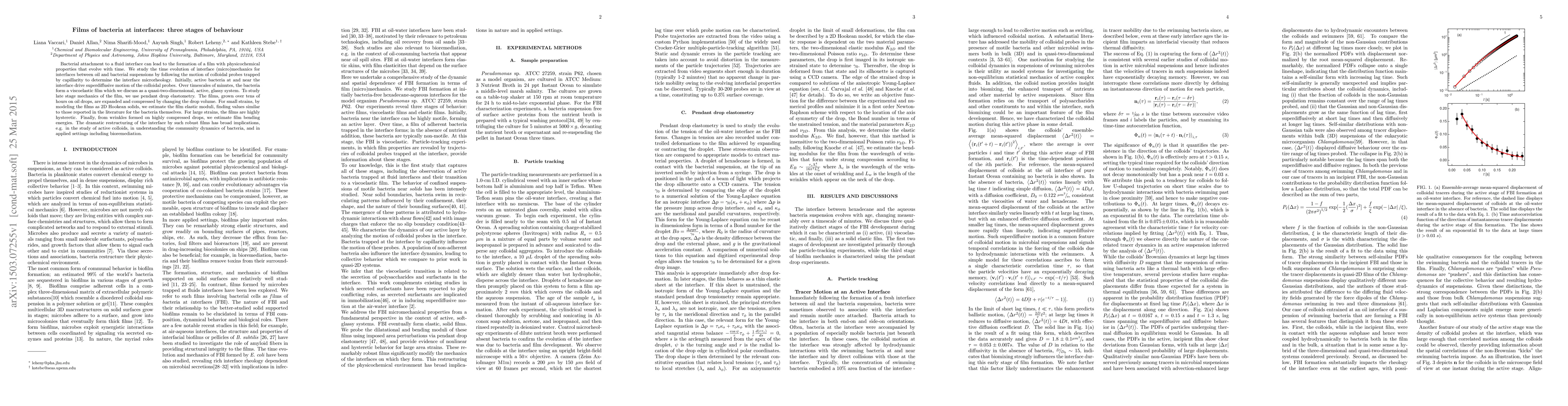 This paper investigates the time-dependent evolution of bacterial films at oil-water interfaces, identifying three stages: initial superdiffusive probe motion, formation of a viscoelastic film, and late-stage elastic and hysteretic behavior under strain. The study highlights the implications for understanding bacterial community dynamics and applications in bioremediation.