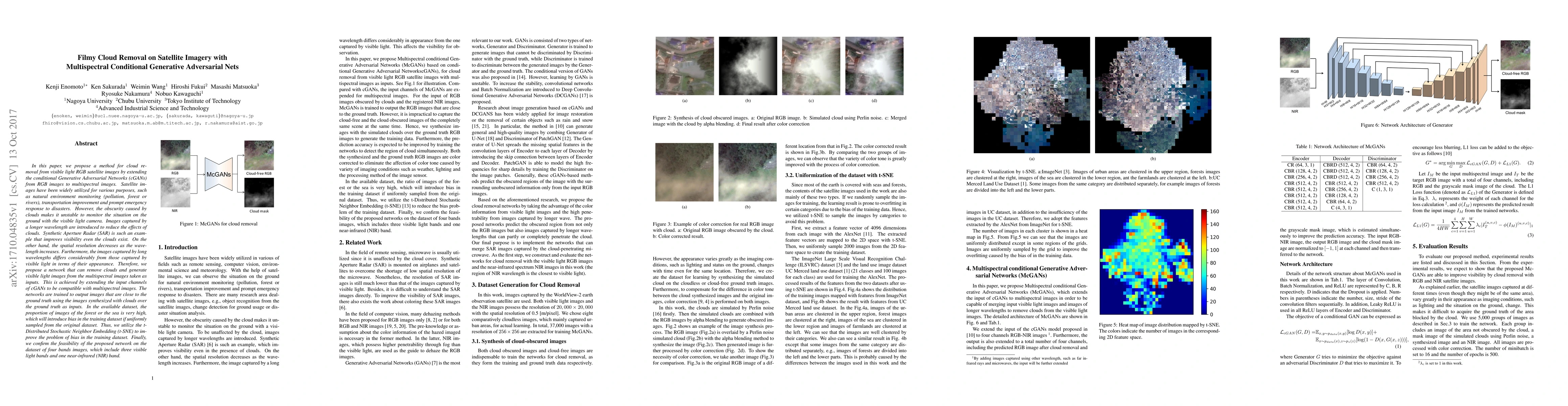 This paper proposes a method using multispectral conditional Generative Adversarial Networks (cGANs) to remove clouds from visible light RGB satellite images, enhancing ground monitoring. The method addresses the issue of cloud obscuration by generating clear visible images from multispectral inputs, utilizing t-Distributed Stochastic Neighbor Embedding (t-SNE) to mitigate training dataset bias.